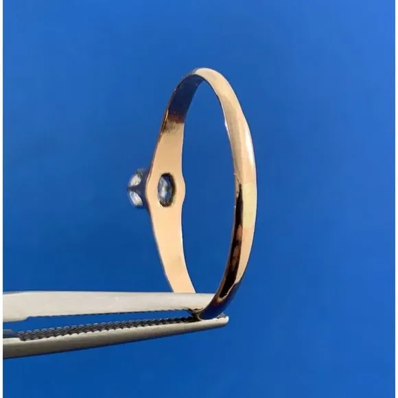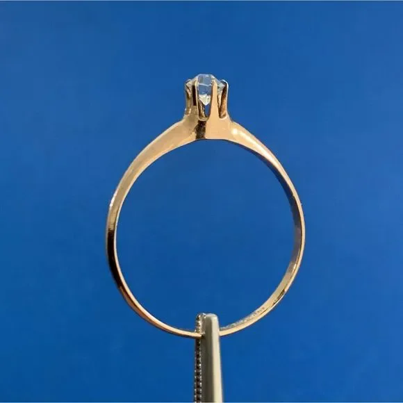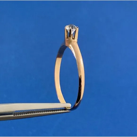 * Estate Robin Hood 10K Rose Gold Cubic Zirconia Solitaire Engagement Promise Ring* Ring size: 9* Band width: 1.78 mm to 2.65 mm* Height: 1/4"* 1 CZ measures approximately 3.65 mm * Weight: 1.1 tgw* Marked: Robin Hood * Professionally assayed.* Ring can be resized for an additional fee.* Condition: As pictured.* G3857
