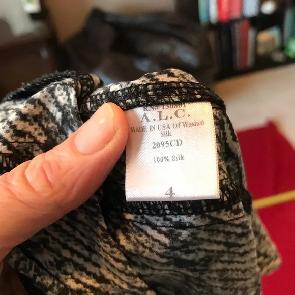 A.L.C Silk Print Racing Stripe PantsBeautiful pants with a blend of blues/ greys/ black, and a print reminiscent of animal printCute for work, weekend, or vacationSlight artsy vibeI have a matching silk sleeveless blouse in my closet if you’d like to make it a setGood preowned conditionThis brand can be sold at RevolveComfortable and chic for walking through the city, holidays at home, brunch with the girls, etc.
