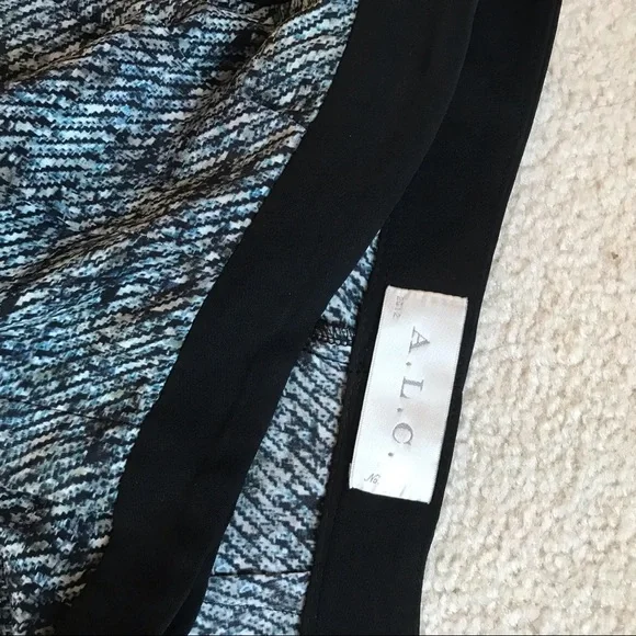 A.L.C Silk Print Racing Stripe PantsBeautiful pants with a blend of blues/ greys/ black, and a print reminiscent of animal printCute for work, weekend, or vacationSlight artsy...