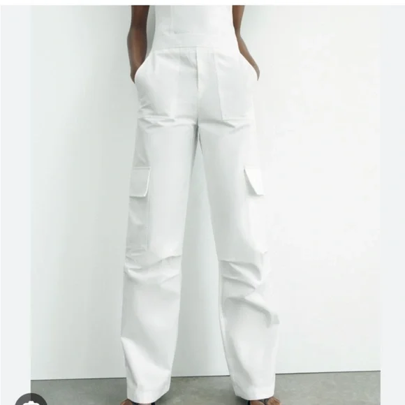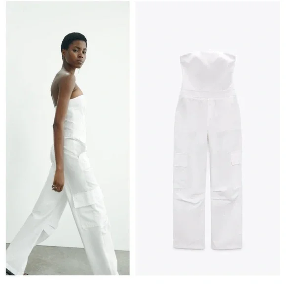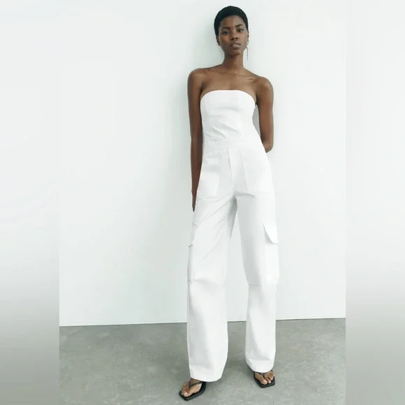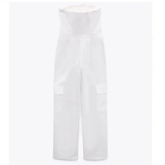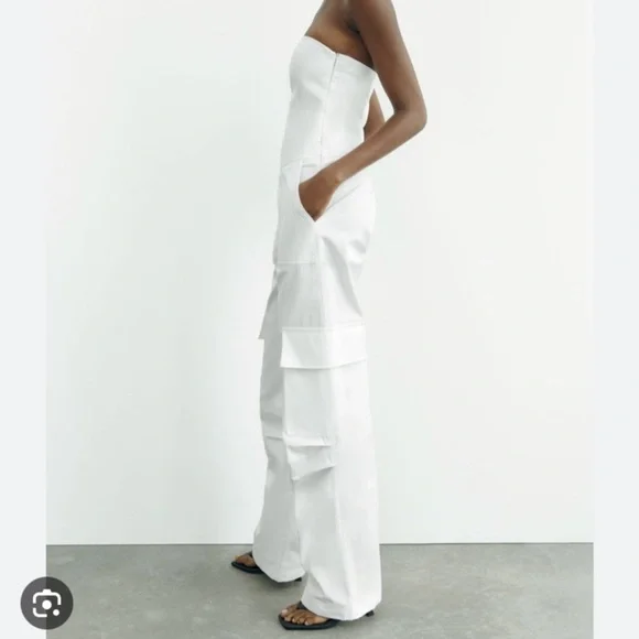 NWOT TAG ZARA LONG CARGO JUMPSUIT SIZE XSCOLOR WHITENever used, I´m selling it because it´s a little long for me.Strapless long jumpsuit with straight neckline.Side pockets and patch pocket at leg.Side hidden in-seam zip closure.Cotton.