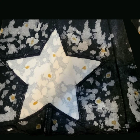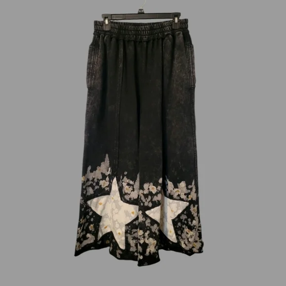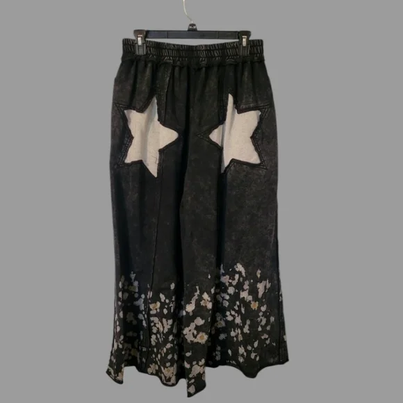 NEW from my closet, was just not right for me. So you are in luck to get it at a cheaper price. Some items come with the tags on some don´t because I removed them or it came to me like that.Great black mineral washed French Terry wide leg pants with grey star Patchwork Details:Star Patchwork on butt and front legsElastic waistTwo front pockets Raw seamsRaw hemSize: XLWaist: approx 15" stretching to20" easily Inseam: 24"Rise: approx 14"Color: Black mineral wash and greyMaterial:53% Cotton 47% Polyester
