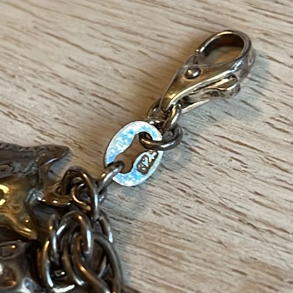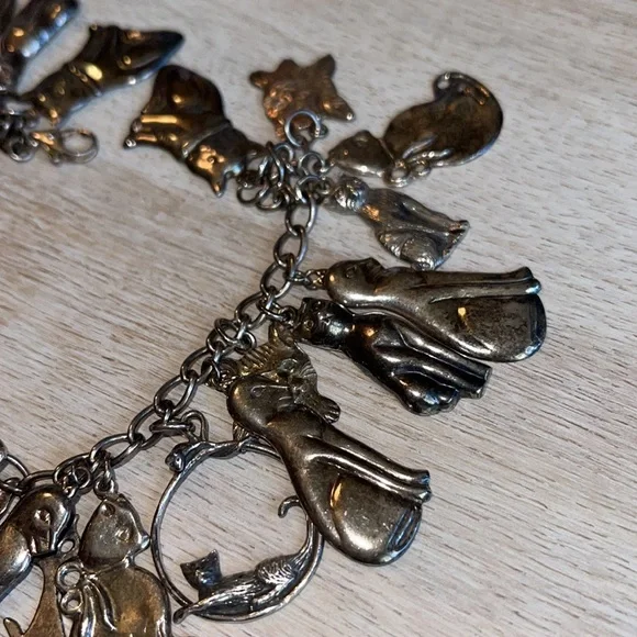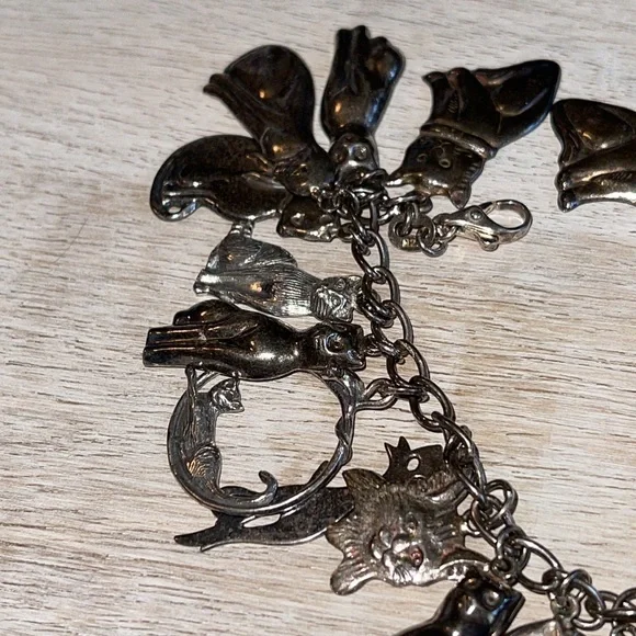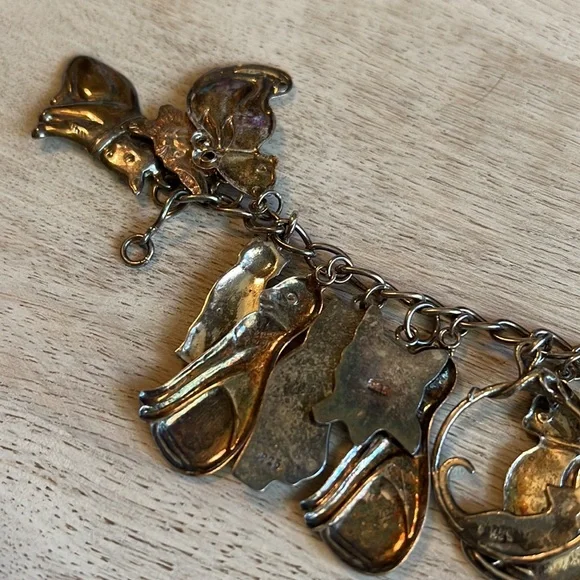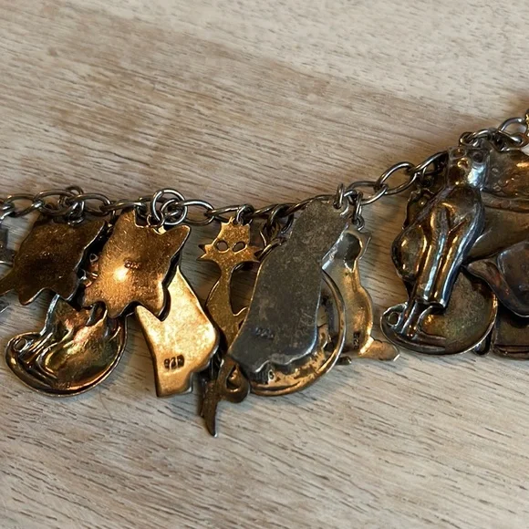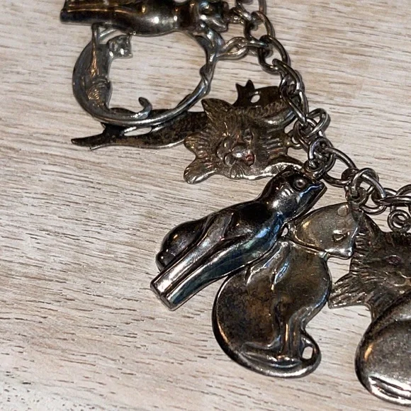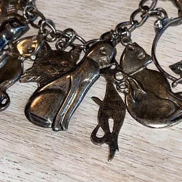 Gorgeous vintage sterling silver cat charm bracelet.Weighs 41.1 grams.Bracelet and charms stamped 925.7.5 inches long.Excellent condition.Needs cleaning.
