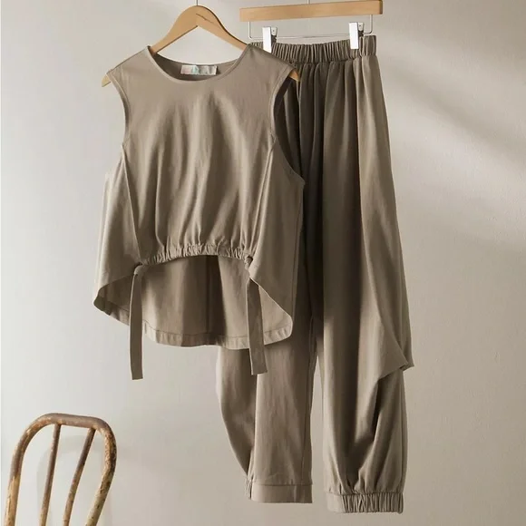 Love this very forgiving and stylish set! Fit wise it runs about a size or two too big. I’m 5’ 135lbs I usually wear a medium sometimes large because I’m big in the middle, in this picture I’m wearing an XS. The color is kinda grey/brownSoft, durable, and breathable, this style is made from 100% natural cotton.So slouchy and cool, this set from free-est will be your go-to from the beach to the city sidewalks.Fit: Top: Loose, muscle-inspired silhouette; Pants: Billowy, low-slung harem fitFeatures: Top: High crew neckline, capped sleeves, rounded hem with cinch tie detail; Pants: Pull-on design, drapey paneling, banded hemsWhy We ❤ It: Perfectly paired together or effortlessly styled separately, this set has endless ways to wear.free-estComprised of textured, free-flowing wardrobe staples and seasonless knitwear, free-est is our beloved in-house collection for every day and any wear.Care/ImportMachine Wash ColdImportMeasurements for size smallInseam: 21.25 inWaist: 28 inRise: 16 inTop Bust: 43 inTop Length: 24.75 inContents100% CottonExamine Photos for Best Description! I provide ample photos with good lighting so you can discern condition as my standard may not be the same as yours.Make an offer now or like for price drop updates. check out my closet for more great items.Bundle and Save!730
