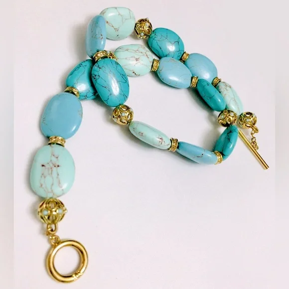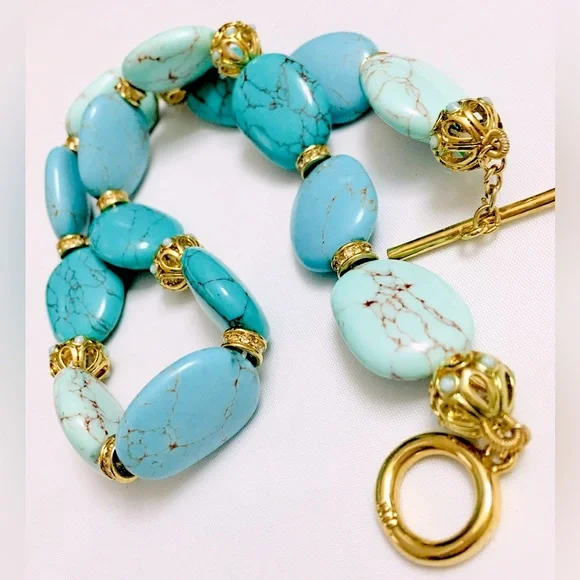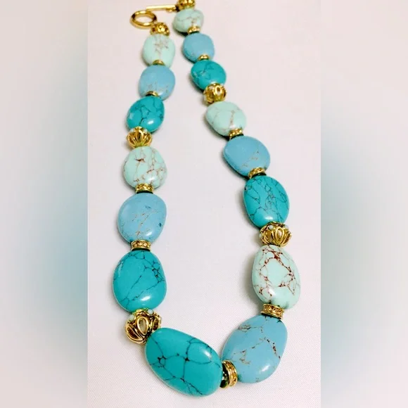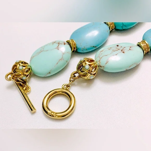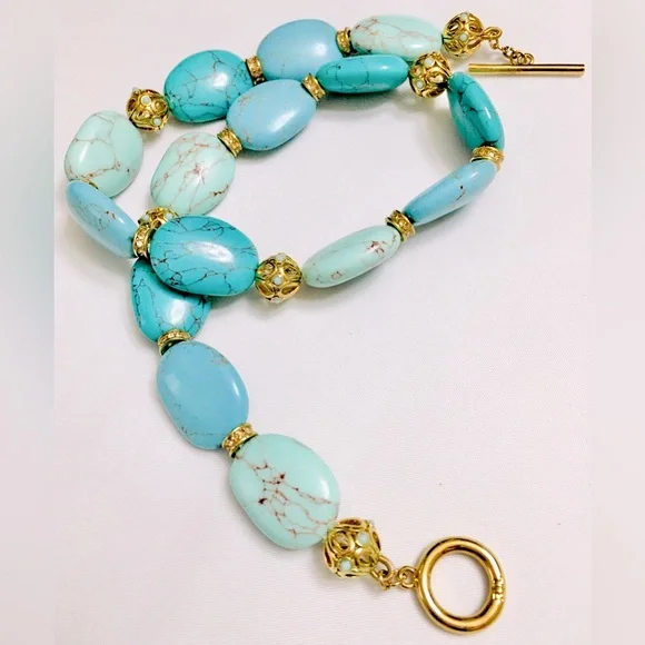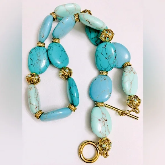 Turquoise stones, gold tone metal, signed on clasp, someone on ruby lane is selling similar piece for 400, baroque style gold and turquoise beads, gorgeous luxury designer piece
