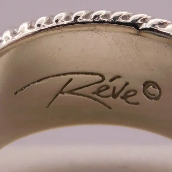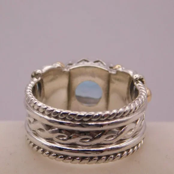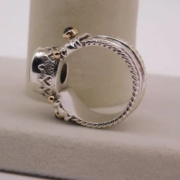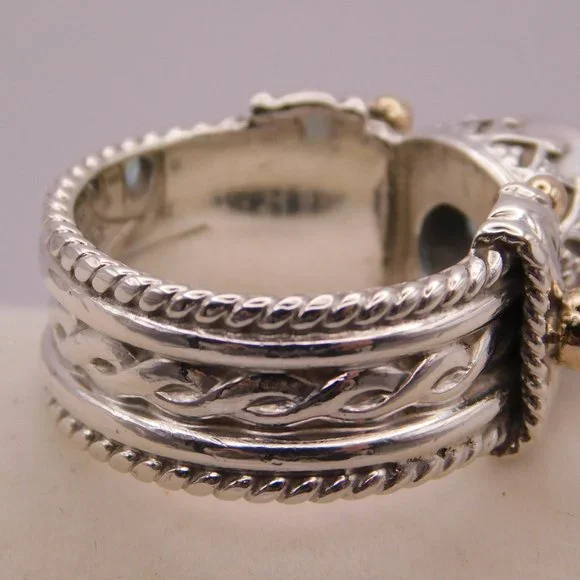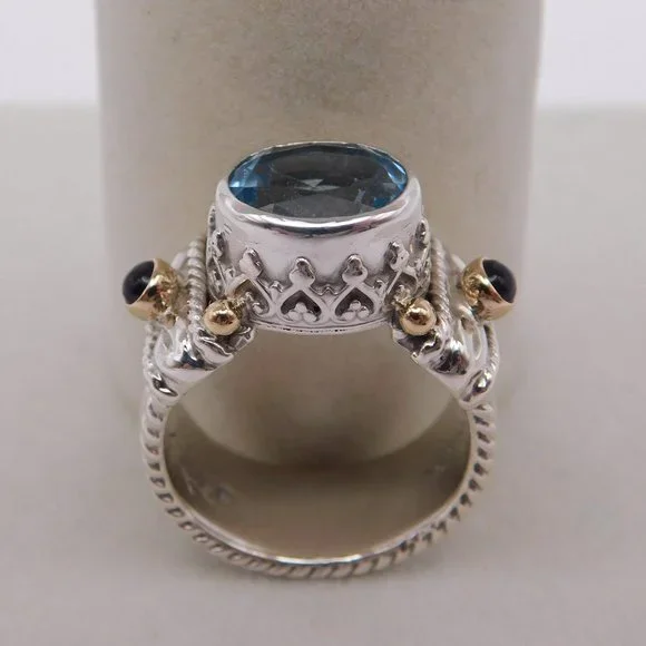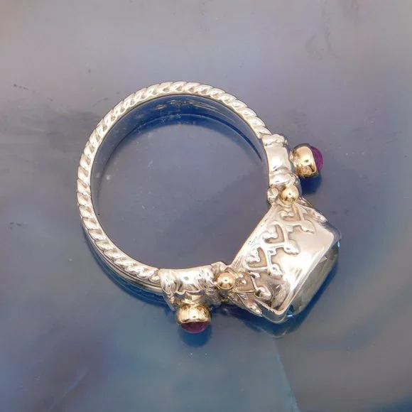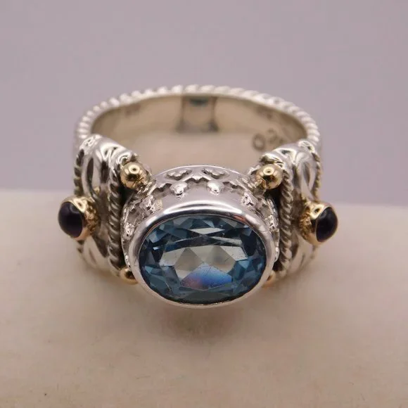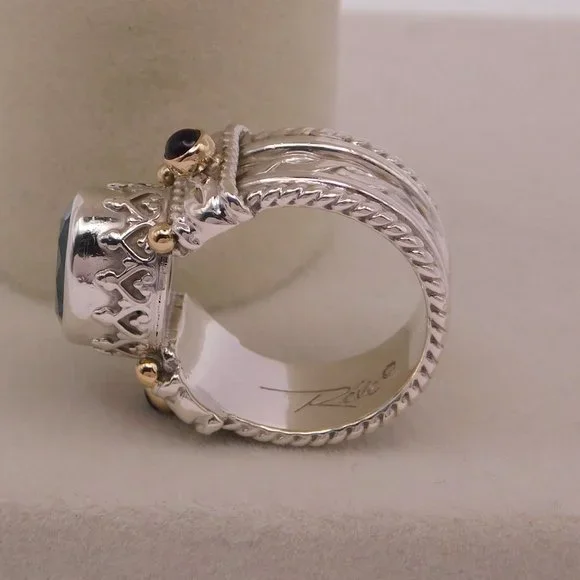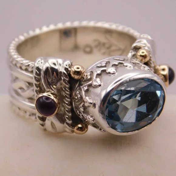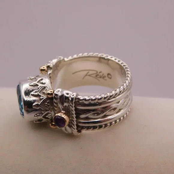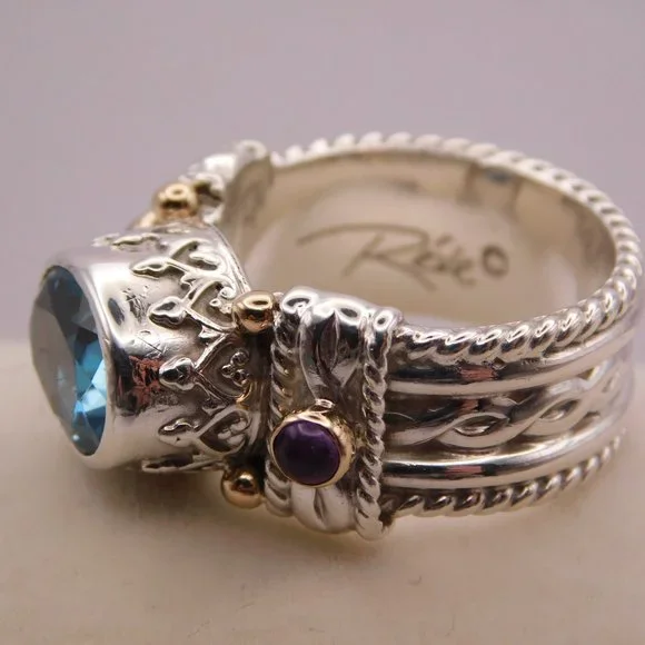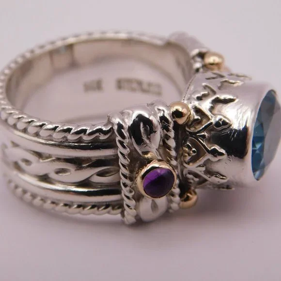 Signed Reve 925 with 14 K accent beads .Large blue topaz stone with 2 amethyst stones accenting the center stone.The band is a beautiful scroll design and1/4 inch wide.