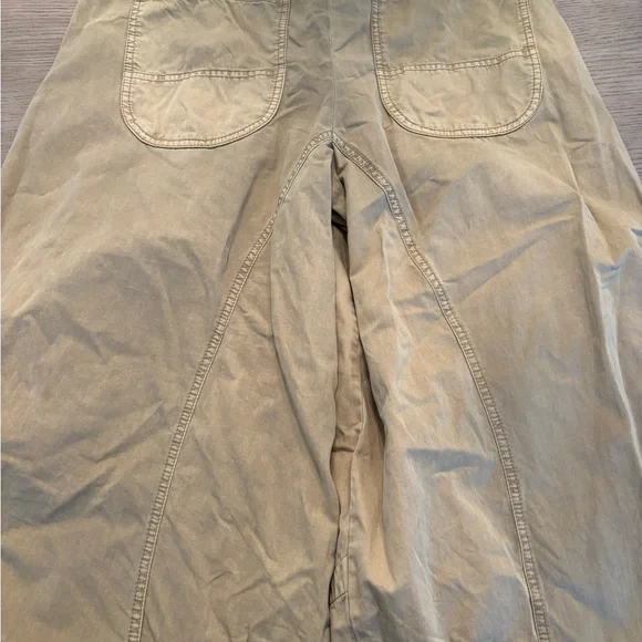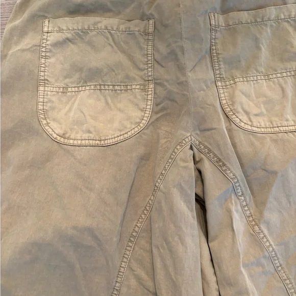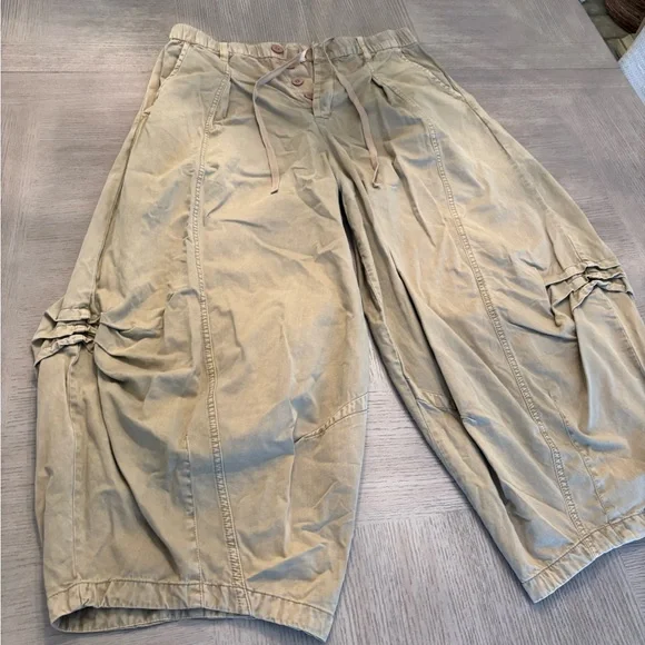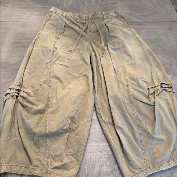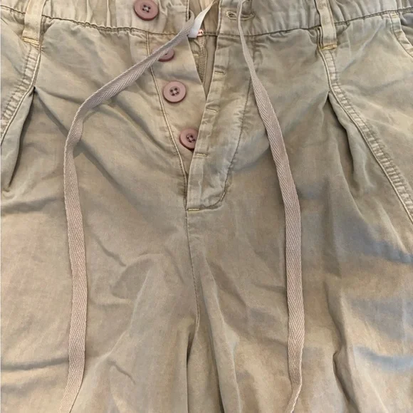 Stylish tan cargo pants with drawstring waist and side pockets.