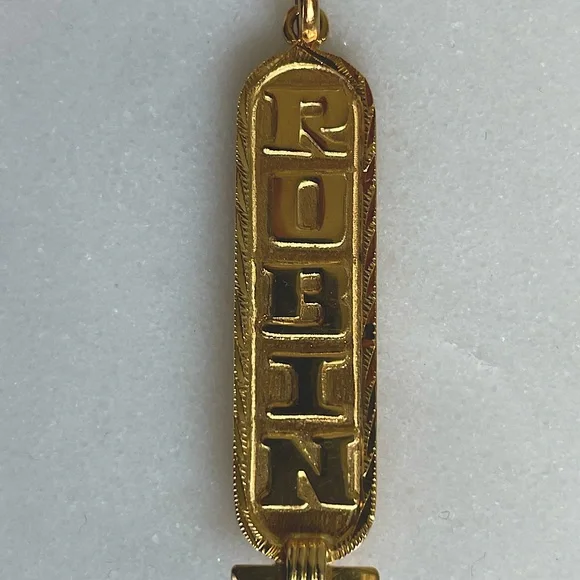 Vintage 18K Yellow Gold Egyptian Solid PendantSymbols on one sis and name Robin engraved on the other side Cartouche used in Ancient Egypt. Material: solid 18K Gold
