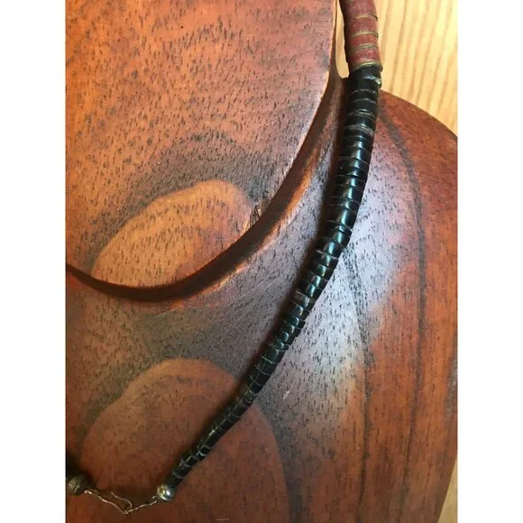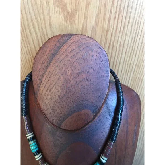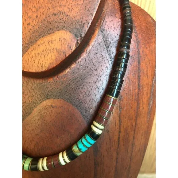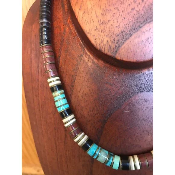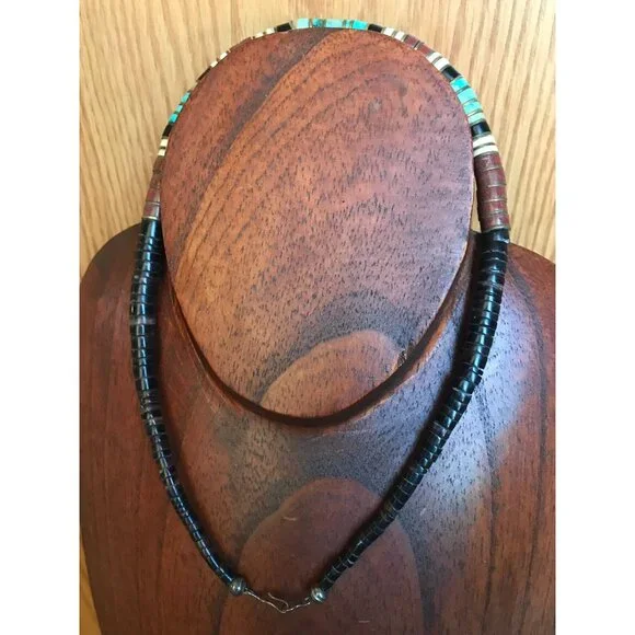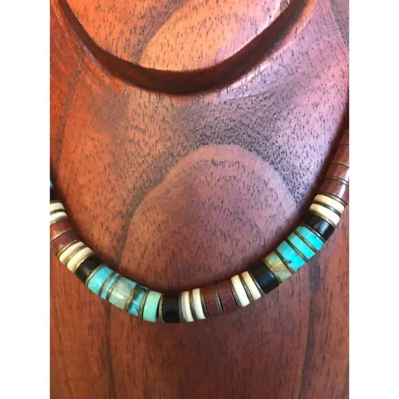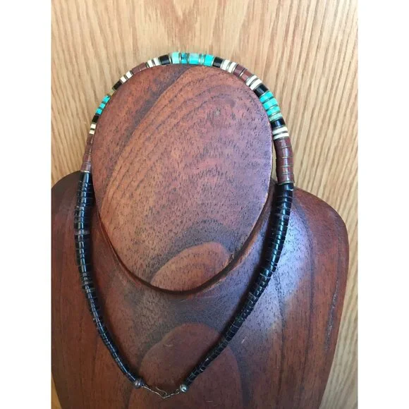 Vtg Heishi Necklace Shell Disc & Turquoise Beads With Various Other Gemstones Sterling Silver Ball The ClaspBeautiful,handmade necklace from the 1970´s.We have a large collection of vintage turquoise jewelry.This gorgeous necklace is so unique.The disc beads are turquoise and onyx with metal thin separator discs.The tiny graduated beads are just beautiful in various different gemstones.Towards the the clasp of the necklace there is a round sterling silver beads.This pattern is repeated on each side of the necklace.The closure is a metal hook.Stunning piece of vintage Santo Domingo Pueblo Indians exquisite bead making.The Santo Domingo Pueblo is located along the Rio Grande River and is less prominent than the Navajo, Hopi and Zuni Jewelry makers. They are known primarily for a type of necklace Heishe or Heishi Necklace.Heishi NecklacesThe Santo Domingo Heishi Necklace is made shaping shell or stone, often turquoise, into small disk shapes and stringing them together to form a simple yet elegant piece of Native American jewelry. The disks are shaped into various sizes and often tend to get larger at the base of the necklace. Some pieces include two loops called ‘Jacla’ which original were worn as earrings, but have since been moved to the base of the heishi necklace for ornamental purposes.The piece featured below is by Clinton Pete and is an example of a perfectly executed Heishi necklace in traditional style.