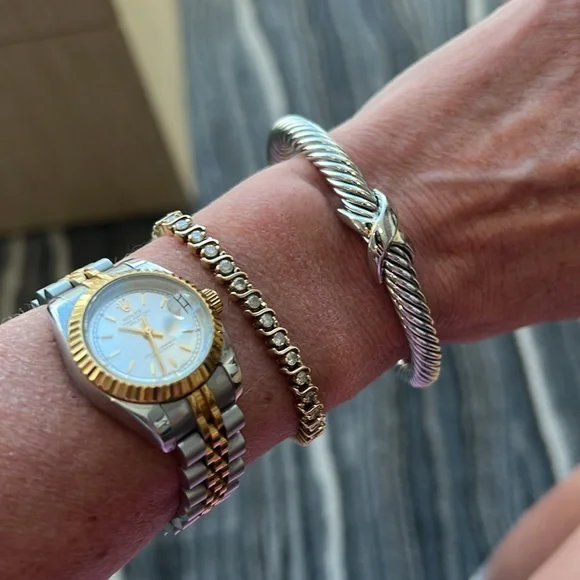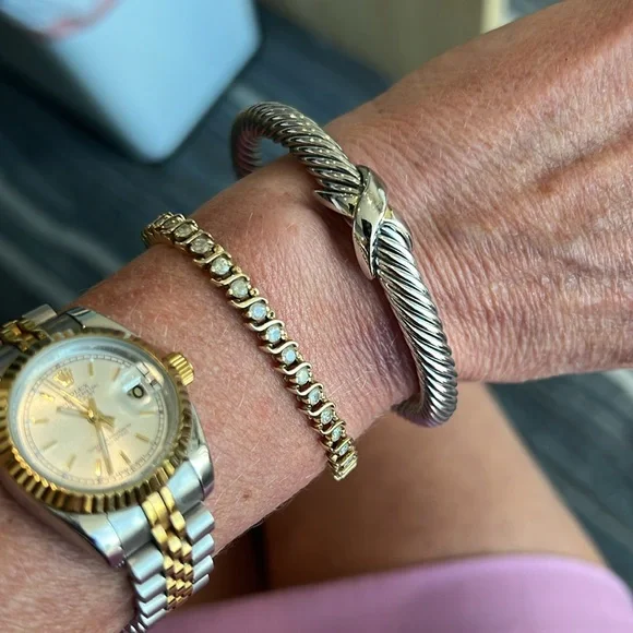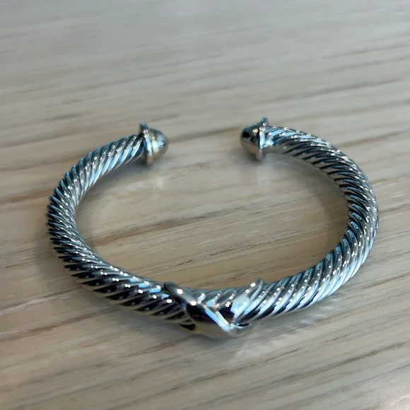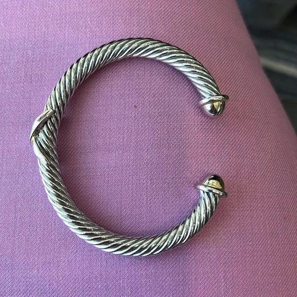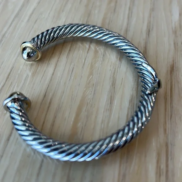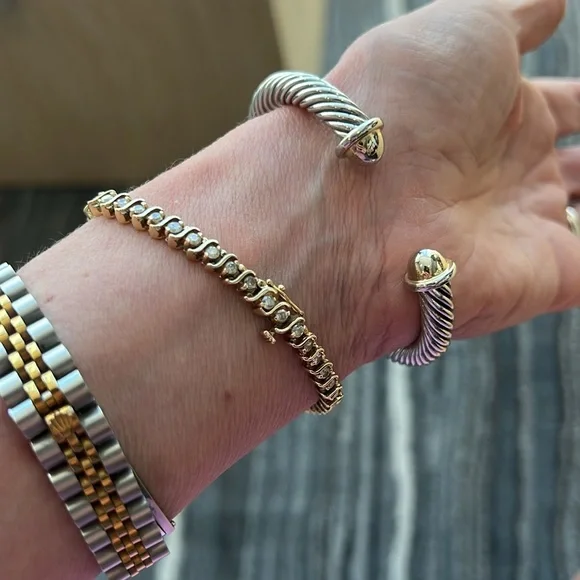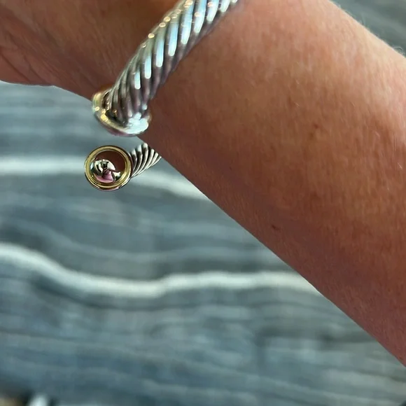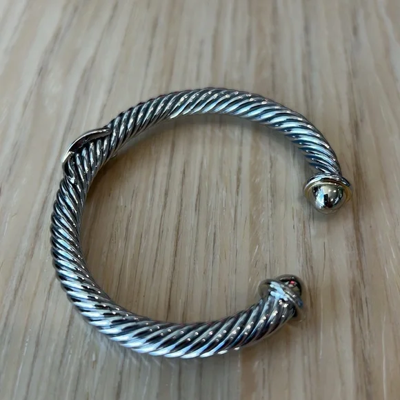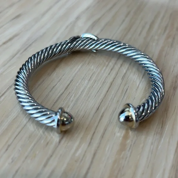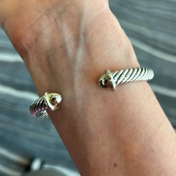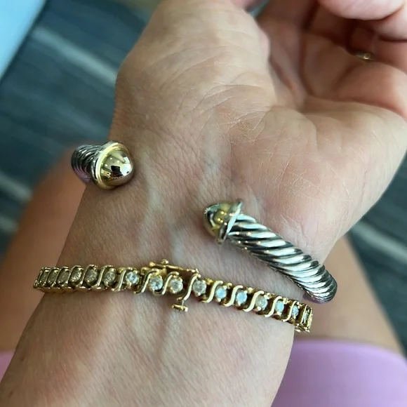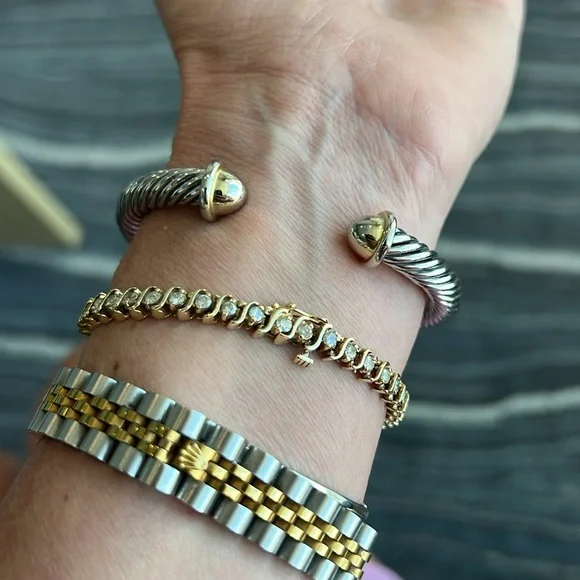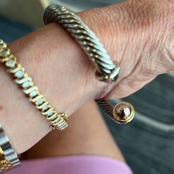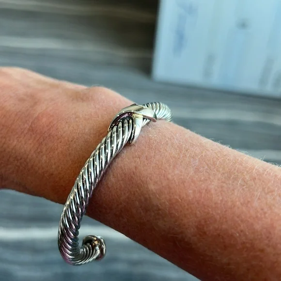 Samuel B. brand. Beautiful gold/silver bangle bracelet in perfect condition and with no flaws. Excellent quality and very solid and durable. The bracelet and X are silver and the open tips are gold. Lovely piece of jewelry mixed with other bracelets and watches or worn by itself.