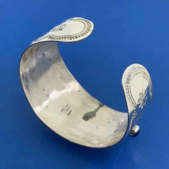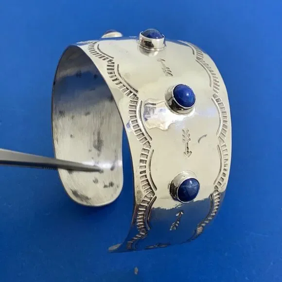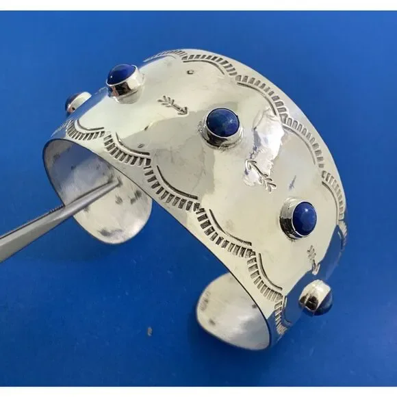 * Taxco Mexico 925 Sterling Silver Lapis Lazuli Storyteller Open Cuff Bangle Bracelet* Inner cuff measures: 6"* Gap measures: 7/8"* Band width: 3/4" to 1-1/4"* Weight: 33.1g* 5...