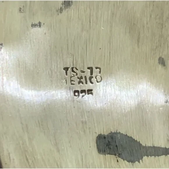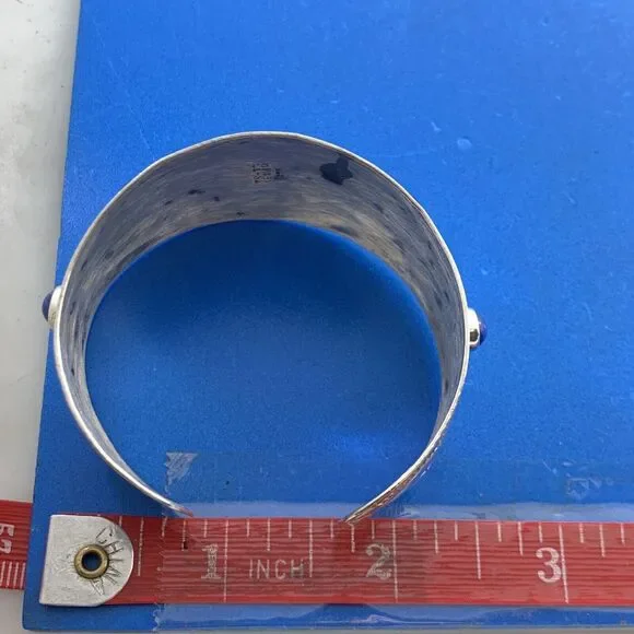 * Taxco Mexico 925 Sterling Silver Lapis Lazuli Storyteller Open Cuff Bangle Bracelet* Inner cuff measures: 6"* Gap measures: 7/8"* Band width: 3/4" to 1-1/4"* Weight: 33.1g* 5 Lapis lazuli measure approximately: 5.4 mm round each* Marked: TS-77 * MEXICO * 925 * Condition: As pictured. (IHZ)* S5400