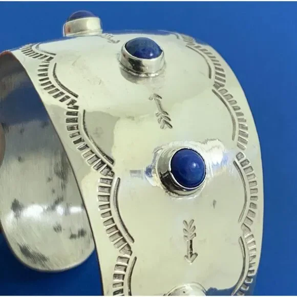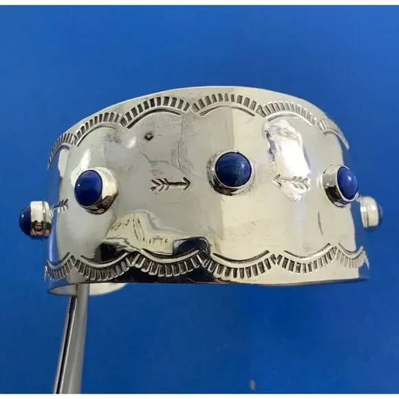Taxco Mexico Sterling Silver Lapis Lazuli Storyteller Open Cuff Bangle Bracelet