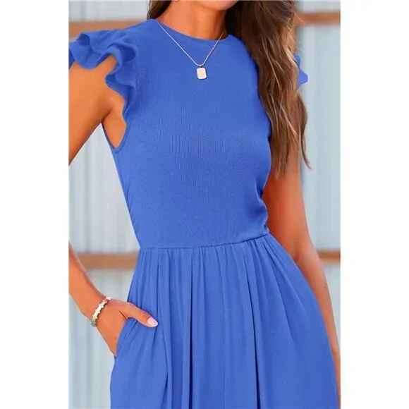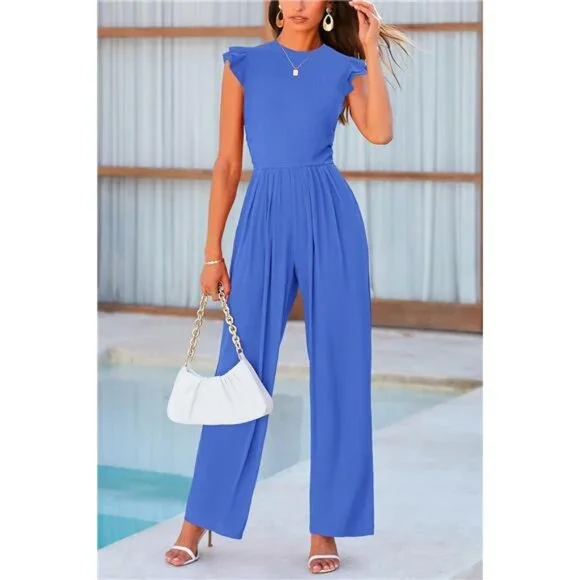 S=US 4-6,M=US 8-10,L=US 12-14,XL=US 16-18,XXL=US 20.Crafted From Soft and Stretchy Rib Knitted Fabric,This One Piece Jumpsuits for Women Ensures A Comfortable and Free Range of MotionThis Crew Neck Jumpsuits for Women Dressy Is Ideal for Summer and Spring.The High Waist,Concealed Back Zipper Jumpsuit,Ruffle Cap Sleeves Rompers and Wide Leg Pants Outfits Make It Both Stylish and Comfortable,Suitable for Any Outfits OccasionWomens One Piece Jumpsuit/Jumpsuits for Women Dressy/Crew Neck Rompers for Women/Ruffled Cap Sleeve Jumpsuits for Women/Summer Outfits for Women/Slim Fit Jumpsuits for Women/Pleated Waist Jumpsuit for Women/Concealed Back Zipper Rompers for Women