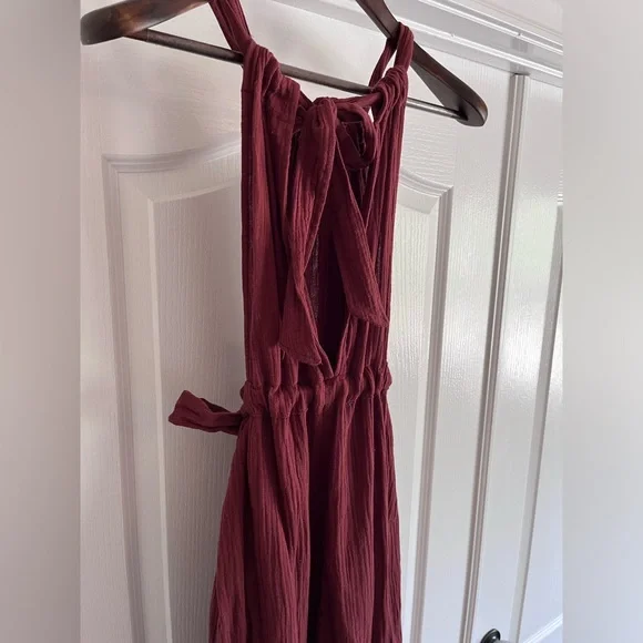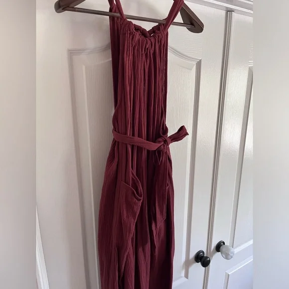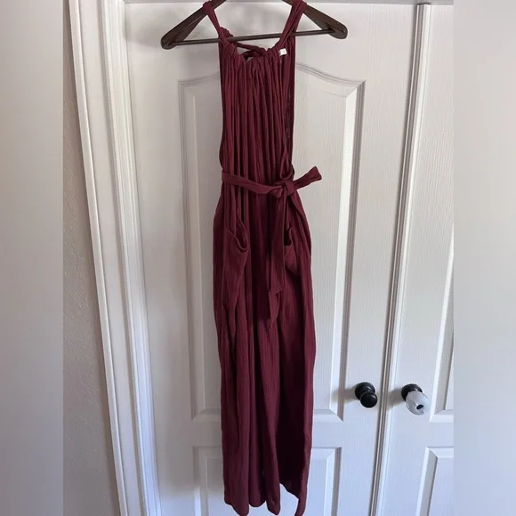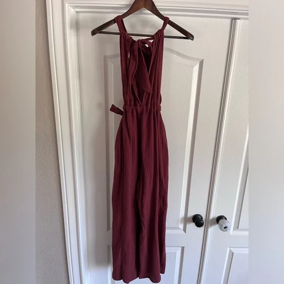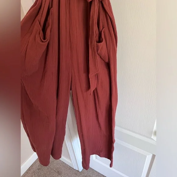 Very soft gauzey fabric, tie waist. Adjustable straps. Open back. Wide leg. Rust color. New without tags