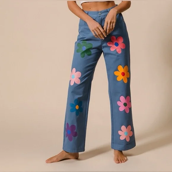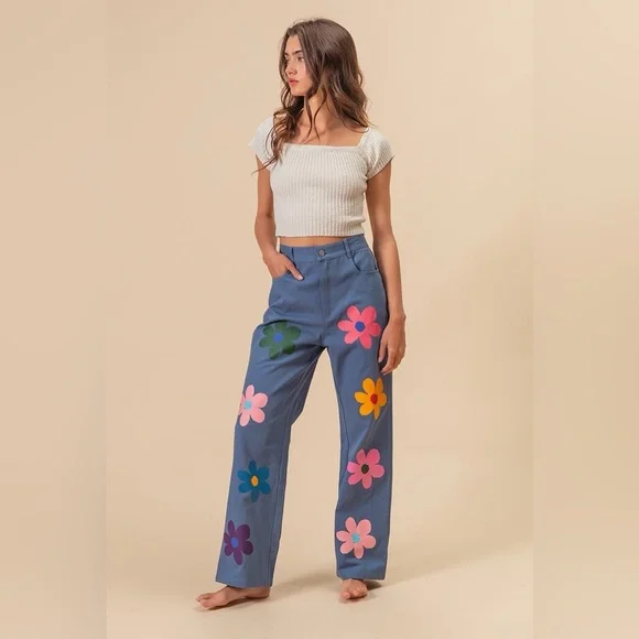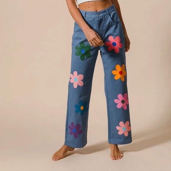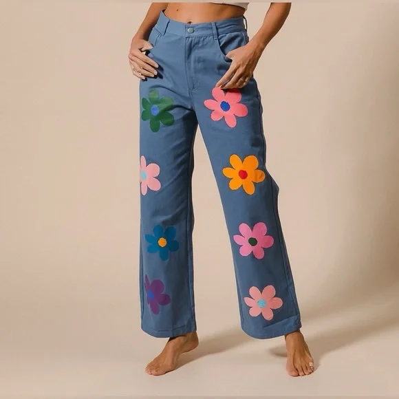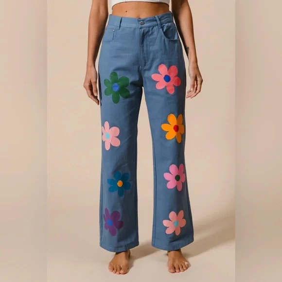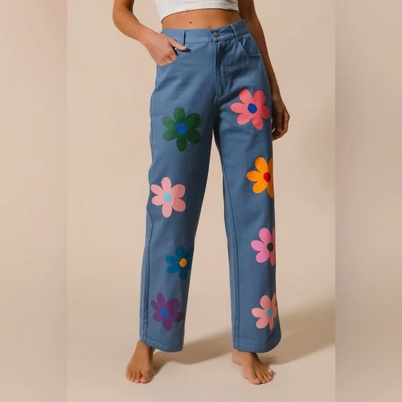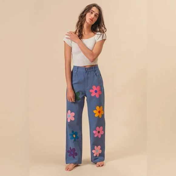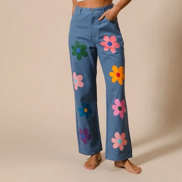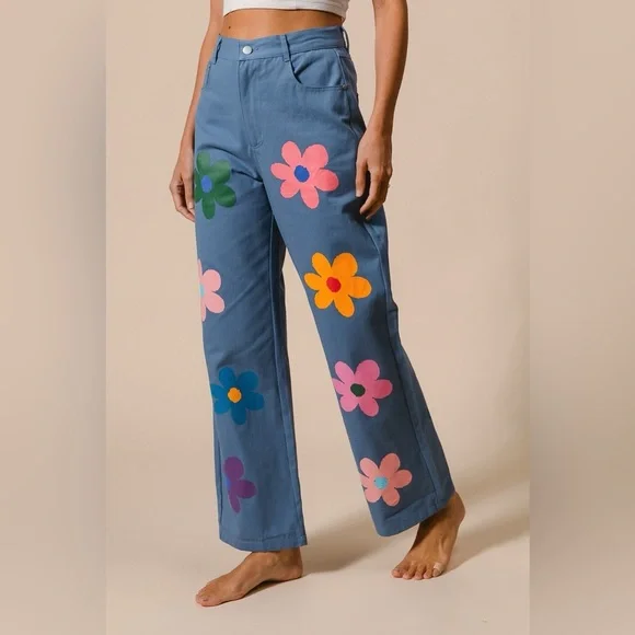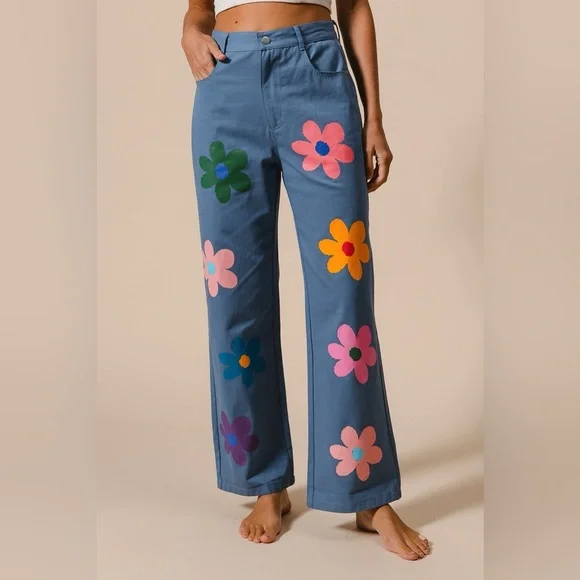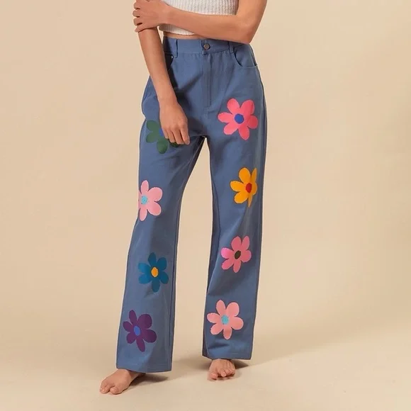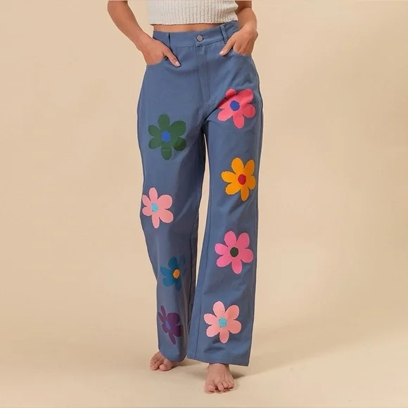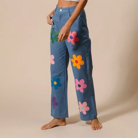 Stylish blue wide-leg pants with colorful floral designs. Perfect for a vibrant look.