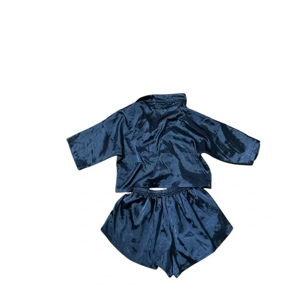 MY MUM MADE IT navy satin pajamas set Short sleeve button down with pocketHigh rise fitRelaxed looser fitIn great pre loved condition. No stains, holes or damagesSz SmallArmpit to armpit 18”Shoulder to hem 16”Waist across 9”Rise 11”Inseam 2”