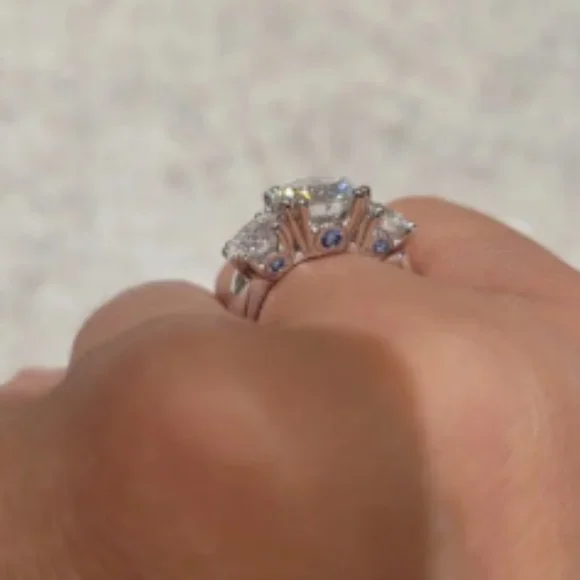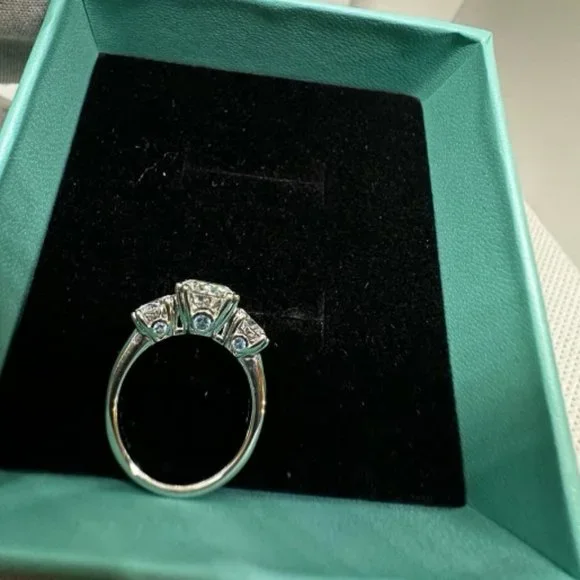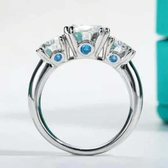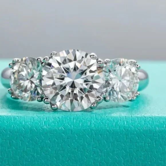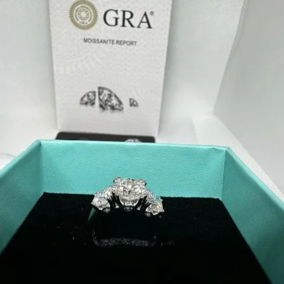 Certified 18K 5CT Moissanite Diamond Ring Brand New!%100 Real Moissanite! Beautiful Ring! Sparkles Like Real Diamonds! Test Real With Diamond Tester! 100% Authentic Moissanite! Stamped 925 Comes With Authentication Certificates & Warranty Card. Perfect For an Engagement Ring, Promise Ring, Anniversary Ring, Wedding Ring! Comes With A Jewelry box, Polish Cloth And Certificate and Cards. Moissanite Is More Brilliant Than Diamonds And Last Forever!Size 6.55CT Luxury Three Stone Engagement Ring. Each Moissanite Stone comes with Certificate and warranty card. •18k White Gold Over Silver•Round Brilliant•Cut Grade: Excellent •Color Grade: D•Clarity Grade: VVS1