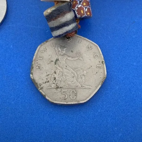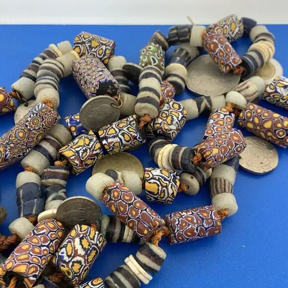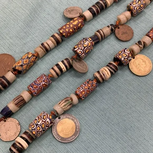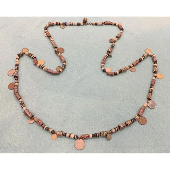 * 1970´s Runway Couture Italy Millefiori Clay Bead European Coin Agate Necklace* Hand Knotted* Length: 82-1/4"* Width: 3/16" to 1-1/4"* Fifty-four (54) Agate beads measure: approximately 10 mm x 8 mm each* Ninety-three (93) various sized millefiori Clay Beads* Twenty-one (21) various European minor coins* Necklace weight: 556.9 tgw* Unmarked* Clasp: Lobster claw* Condition: As pictured. (ZHZ225BR)* C643