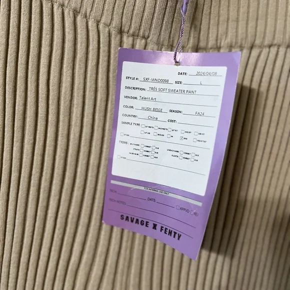 NWT FENTY x Savage tres soft ribbed pantsHush beigePull on styleCotton mix New with tag, sample piece. No stains, holes or damagesSz LargeWaist across 14”Rise 12”Inseam 34”