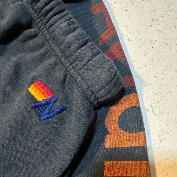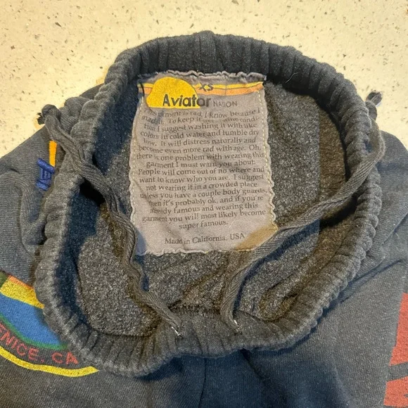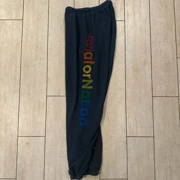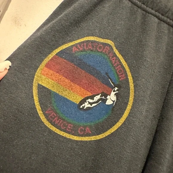 IYKYK, these are the comfiest pants ever made. These are in solid pre-owned condition with no holes rips or tears. Some graphic fading and pilling from normal wear. Color is dark grey/charcoal (not brown at all as it looks in some pics. They are a dark grey with the AVIATOR NATION spelled out colorfully and the Venice logo at the top hip. The classic AN logo is on the back of these, and the drawstring is in full tact. Photos taken in different lighting make them look a little off - but they are a mid to dark grey in base color.And in case you don’t know (from the AN site)The best sweatpants ever. You will live in them.The most comfortable sweatpants you´ll ever own. Our single needle stitch work gives each garment a unique, one of a kind effect. All of our products go through an intense breaking-down process that gives them a vintage feel you´ll love because it´s broken in from day one of wearing it. You´re going to live in these sweats.- Hand sewn in our own factory in the heart of Los Angeles- Tri-Blend Fabric: 50% polyester, 38% cotton, 12% rayon- Machine wash cold with like colors. Hang or tumble dry on low.Condition is great with no flaws found.Tip: the only difference between the small and XS is the length for this style.And if you LOVE this brand like I do, search my closet for “aviator nation” for more rad listings.