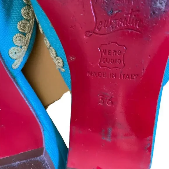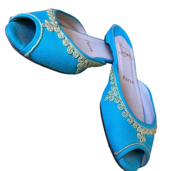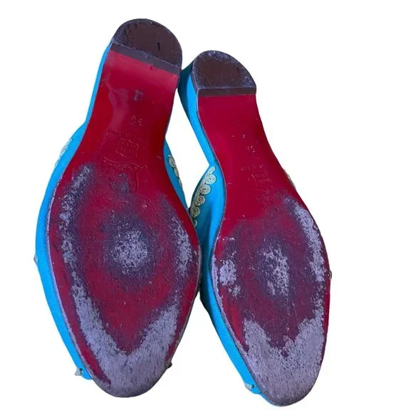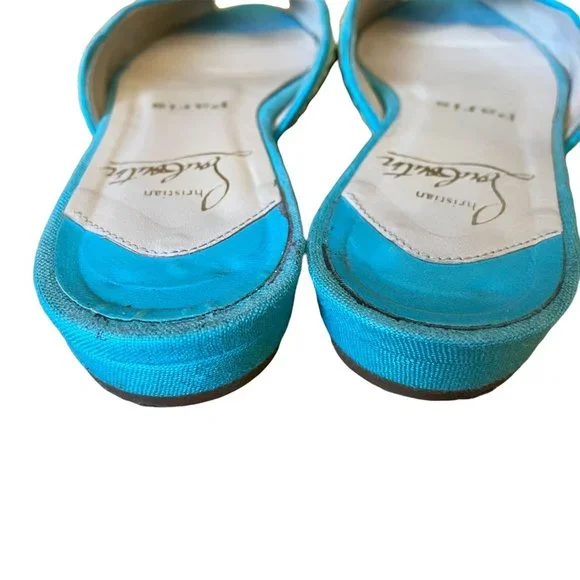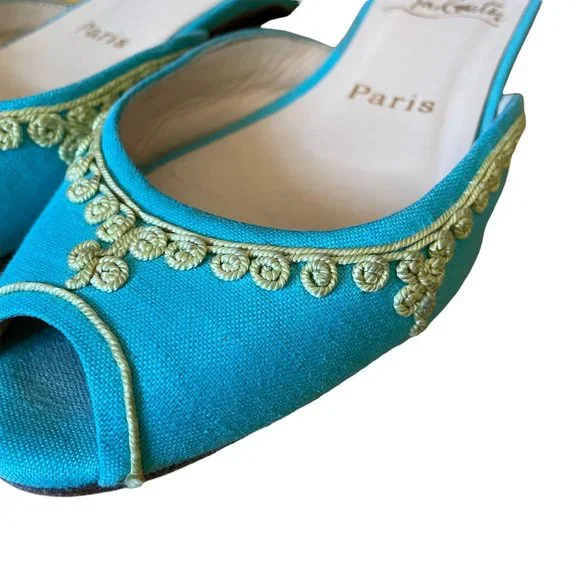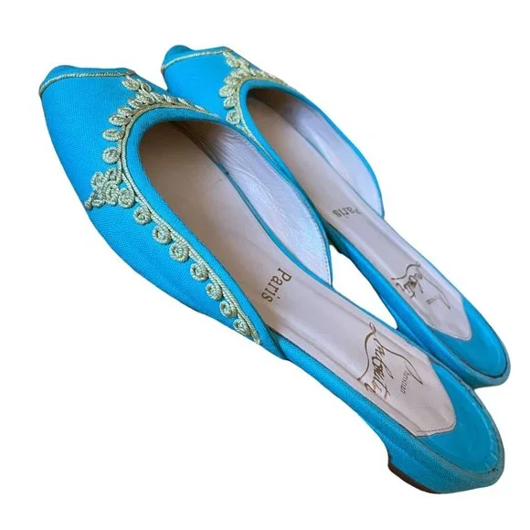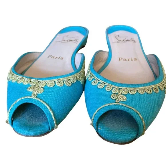 Christian Louboutin Embroidered Slides Aqua and Yellow Size 36Fits more like a 5.5Very Clean Shoe!