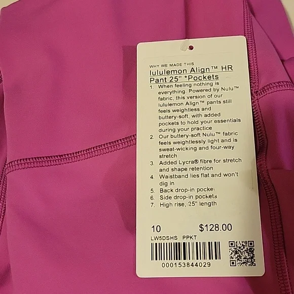NWT: Lululemon Align HR Pant 25" PocketsButtery soft,weightless comfort Perfect for your practice and beyond Hidden waistband pocket keeps small items-like cards-safeA soft, wide waistband offers comfortable coverage that won´t dig inA high-rise waistband keeps you covered during forward folds and downward dog. 25" length is intended to sit above your ankleSweat-wicking fabric pulls moisture away from your skin to keep you feeling comfortable 81% Nylon19% Lycra elastaneSize: 10Color: Pow Pink ToneSmoke free and pet free home