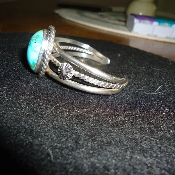 Beautiful Sterling silver cuff bracelet, made in Michigan and never worn.Is 30g. of silver, has a 1 inch by 3/4 inch Sonoran Blue Turquoise Stone.Has flower like pieces on the sides, and a jewelersmark, ,an arrow..on the back.