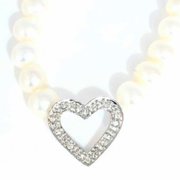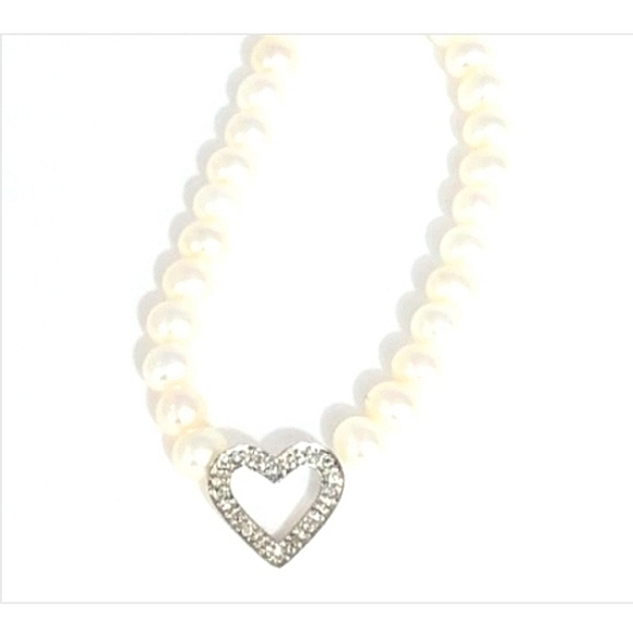 HERE´S ONE FOR THE LADIES--From our Vaults we now Highlight this very Special Offering...An Absolutely Spectacular Fresh Water Pearl Necklace with an Attached 14KT White Gold Genuine Diamond Heart Pendant.These are not Moissonites Masquerading as Diamonds, these are Genuine Diamonds Folks, and YES, there Absolutely is a Huge Difference in both Quality and Value.The Pearls Measure a Desirable ~5.0mm in Size and Present with aGleaming White Cadence and a Highly Lustrous Sheen.The 14K White