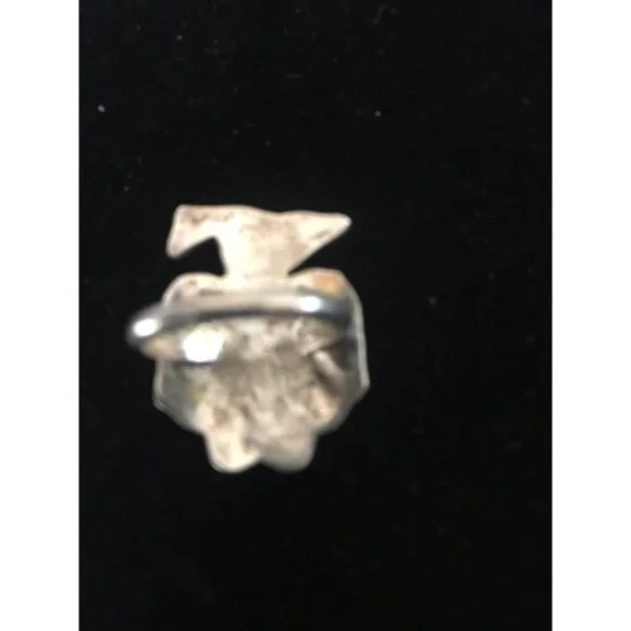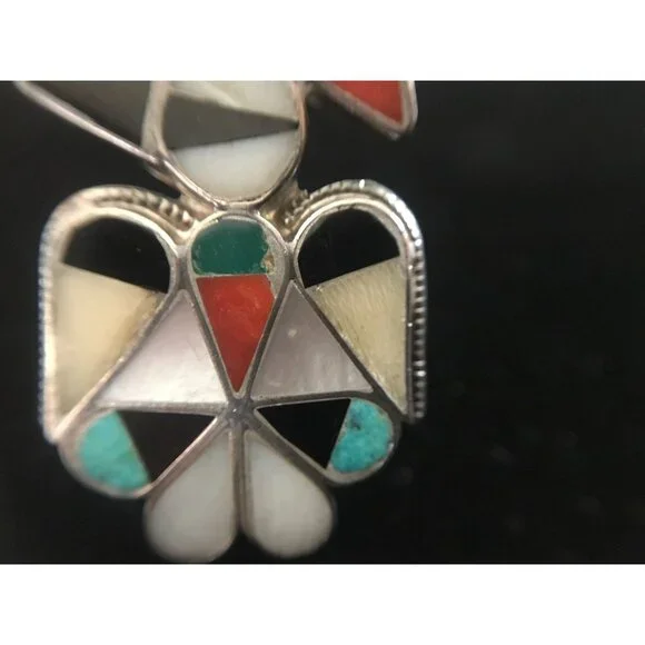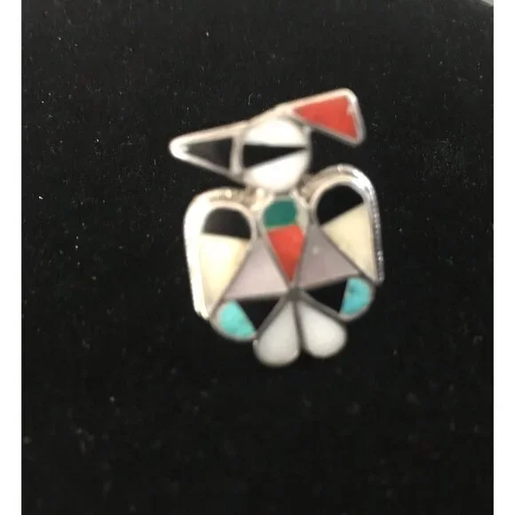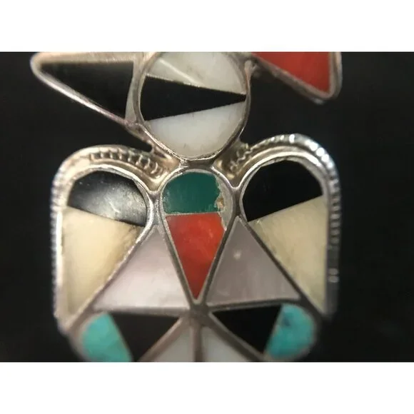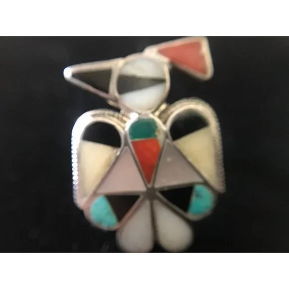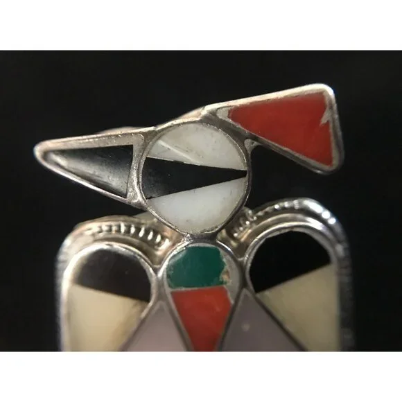 Vtg 1960´s Zuni Thunderbird Turquoise Mother Of Pearl Onyx Coral Bezel Set In Sterling Silver Ring Size 3 1/4This ring is from our large collection of Turquoise vintage jewelry.This is a marvelous vintage Zuni Native American jewelry silver ring. Inlay stones of turquoise, mother of pearl, onyx, coral and pipestone come neatly together to create this thunderbird design, as silver rope enhances the stones while outlining the shoulders and wings!Beautifully constructed,handmade piece with a very classic shape.The face measures 3/4"Please see the photos for the tremendous details.This ring is in excellent condition. Weight:6.3 grams.Thank you so much for checking out our Shop.