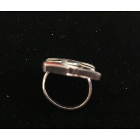 1960´s Zuni Thunderbird Ring Turquoise Mother Of Pearl Onyx Coral Bezel Set 5.5