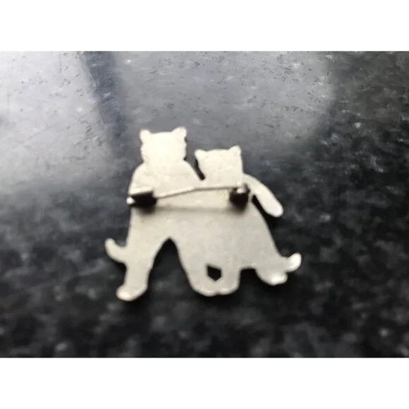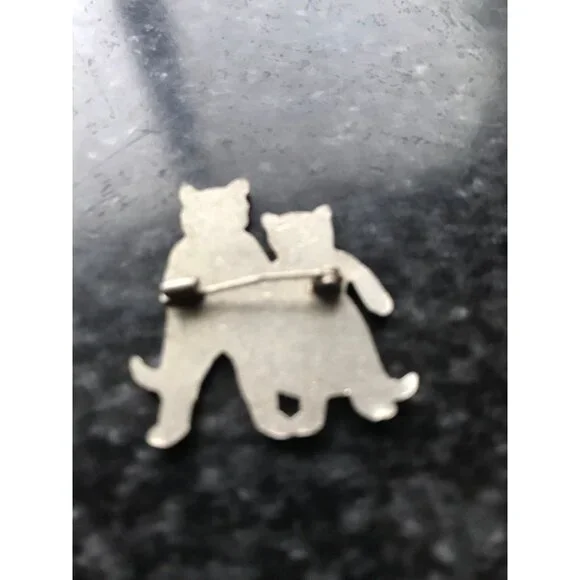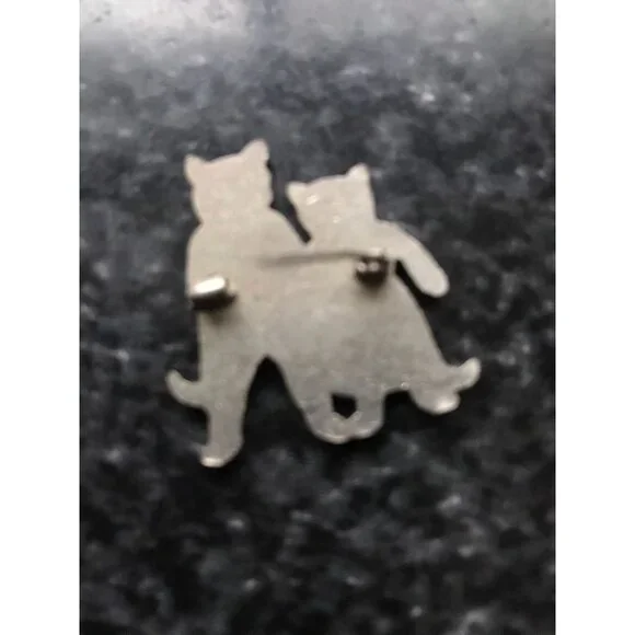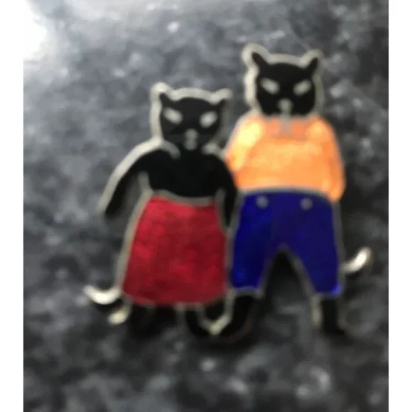 Vintage 1940´s Queen & Tom Black Cat Enamel Pin Brilliant Colors Silver Edging Charming female - male cat pin is from our large collection of vintage jewelry.So much detail to this adorable pin.All sections of the decoration is surrounded by a thin line of silver.The tom cat has a great orange bow tie and orange shirt wearing a pair of deep blue trousers with two silver buttons.Black boots and a black tail.The queen cat is sporting a lovely bright red skirt,black boots, and tail.The pin back is tucked away in its own vintage safety catch.Please see the photos to complete the description.Thanks so much for checking out our Shop.