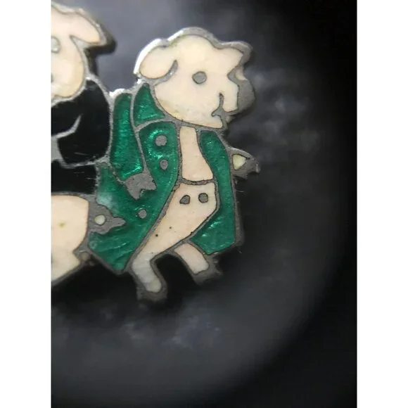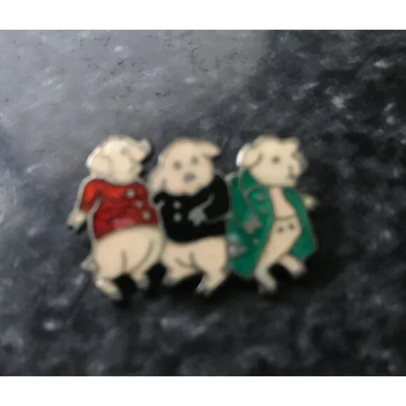 Vintage 1940´s Three Pig Enamel Pin Brilliant Colors Silver Edging Beige Red Black Green Charming three pig pin is from our large collection of vintage jewelry.So much detail to this adorable pin.All sections of the decoration is surrounded by a thin line of silver.The first pig has a red shirt with three silver buttons.Silver shoes and tail.The second pig is sporting a black shirt with two silver buttons,silver shoes and tail.The third pig is wearing a green formal tail jacket with three silver buttons and a pair of beige trousers with two silver buttons,silver shoes.The pin back is tucked away in its own vintage safety catch.Please see the photos to complete the description.Thanks so much for checking out our Shop.