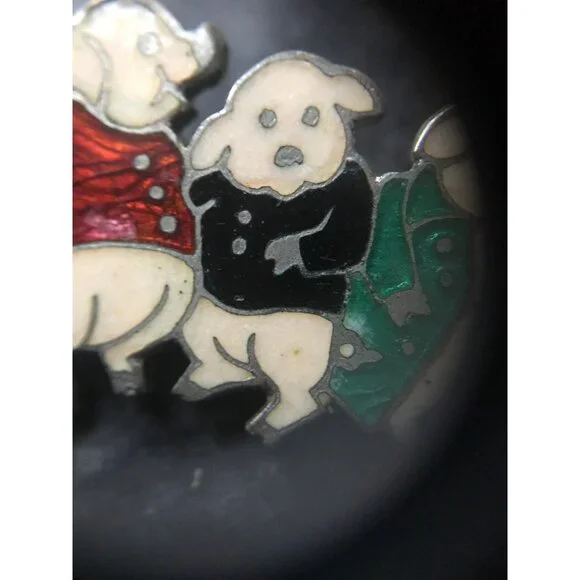 Vintage 1940´s Three Pig Enamel Pin Brilliant Colors Silver Edging Beige Red Black Green Charming three pig pin is from our large collection of vintage jewelry.So much detail...