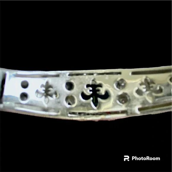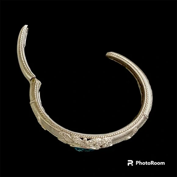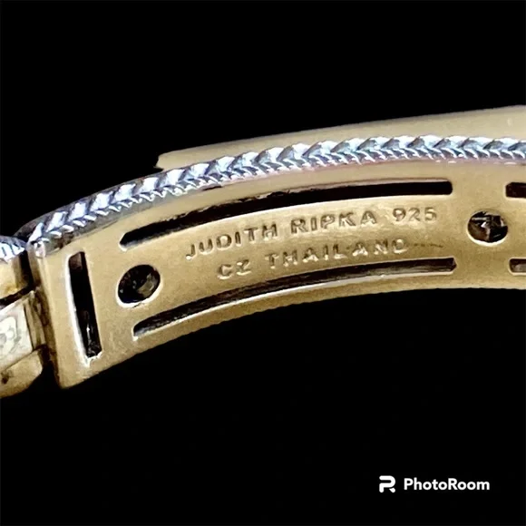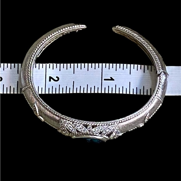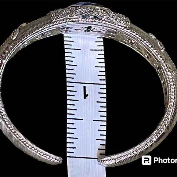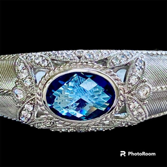Judith Ripka Sterling silver cuff hinged bracelet with beautiful large London, blue topaz surrounded by intricate designs in Dominique czs for maximum sparkle. It’s cuffed and hinged for super easy removal ! I do it with one hand!Size 6. This is really lovely and a hard to find design.