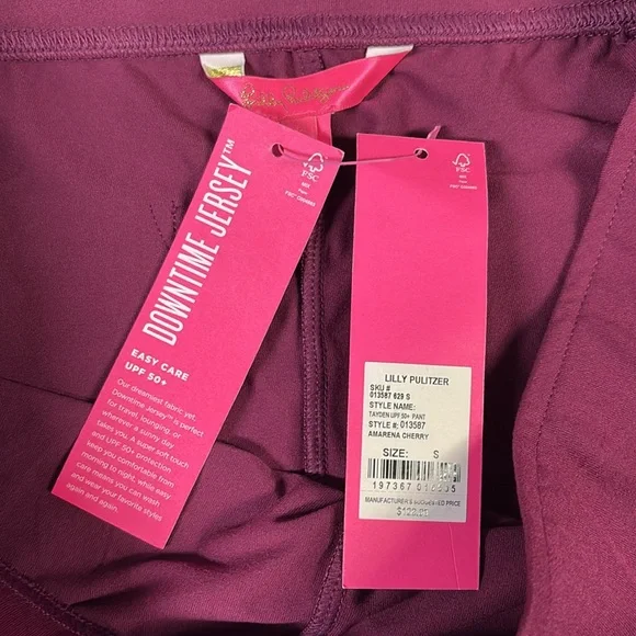 Lily Pulitzer Tayden UPF 50+ Pant Amarena Cherry Size Small NWTMade from our ultra-soft Downtime Jersey, the Tayden Pant is perfect for running around town or lounging at home. This mid-rise, pull-on style offers a timeless straight fit and UPF 50+ sun protection.Back patch pockets31.5" Inseam.Downtime Jersey (88% Polyester, 12% Spandex).