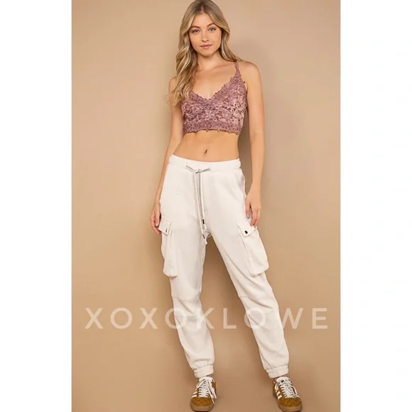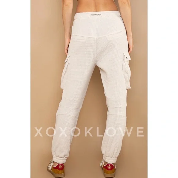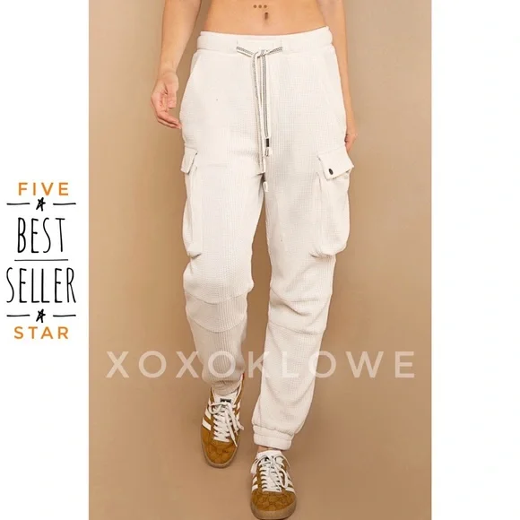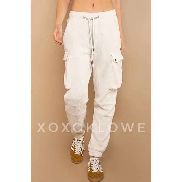 POL Waffle Knit Slouchy Cargo Joggers in CreamBRAND NEW - Also Available in BrickUltra-comfy and so made for lounging, these slouchy pants are featured in a soft medium weight waffle-knit fabrication and full-length style with an adjustable drawstring waistband. Your new favorite airport outfit, these so cozy pants are perfect worn in or out of the house.FeaturesRegular FitColor is OatmealElastic Waist with Designer Drawstring2 Front Pockets2 Side Cargo Pockets2 Back Pockets Elastic Bands at AnklesFabric100% CottonImportedApproximate Measurements - Read DisclaimerSmall Waist 24” to 36” Full Stretch Rise 13” Inseam 27”Med Waist 26” to 38” Full Stretch Rise 13” Inseam 28”Large Waist 28” to 40” Full Stretch Rise 13” Inseam 29”MEASUREMENT DISCLAIMER: Measurements are provided to assist you in making the best sizing choice. All measurements & sizing info given are approximate. They should be used as a guideline & not taken as the exact size of the garment. Sizing can differ between manufacturer batch runs therefore we can never guarantee the item you receive will be the exact measurements stated above. We measure manually so variations can occur. We also may not measure an item the same way you would measure it. Measurement/Sizing differences can & will occur. We do not take responsibility for this.POL Waffle Knit Slouchy Cargo Joggers in Cream
