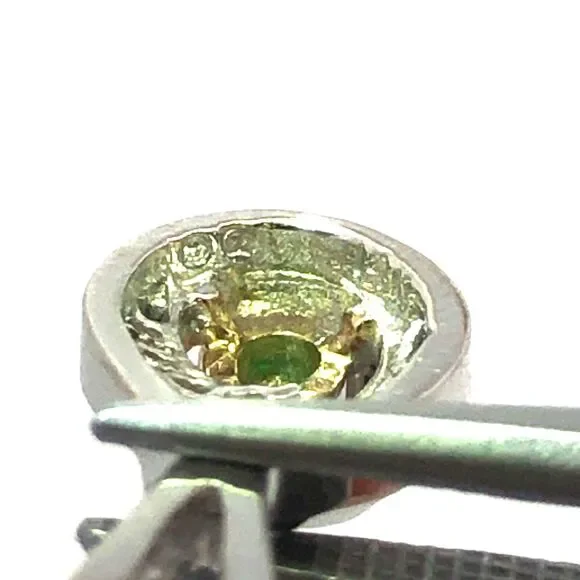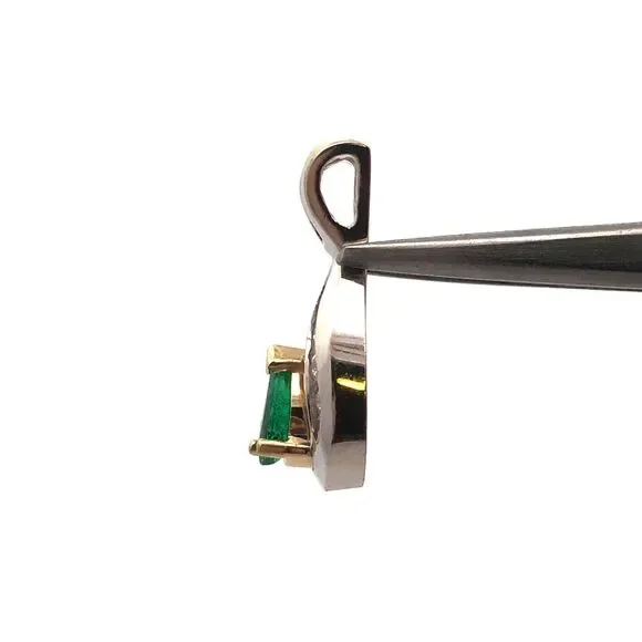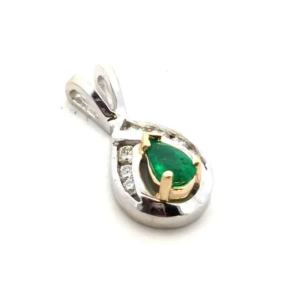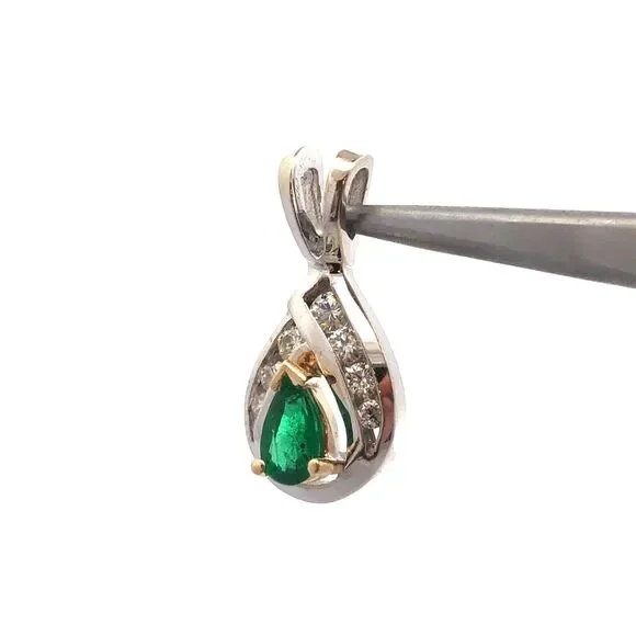 * Designer 14K White Gold Pear Emerald Round Diamond Petite Pendant* Length including bale: 11/16"* Inner bale measures: 3 mm x 1.7 mm * Width: 5/16"* Weight: 1.3 tgw* 1 Pear Emerald measures approximately 4.7 mm x 3 mm * 7 Round Diamonds measure approximately 2 mm to 1.1 mm * Chain is not included, but can be purchased for an additional price.* Marked: OQ * 14K * Condition: As pictured.* G4327