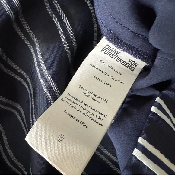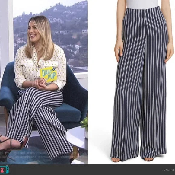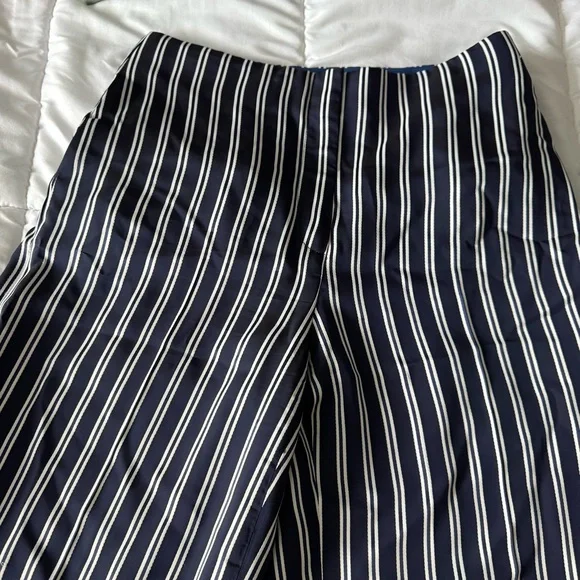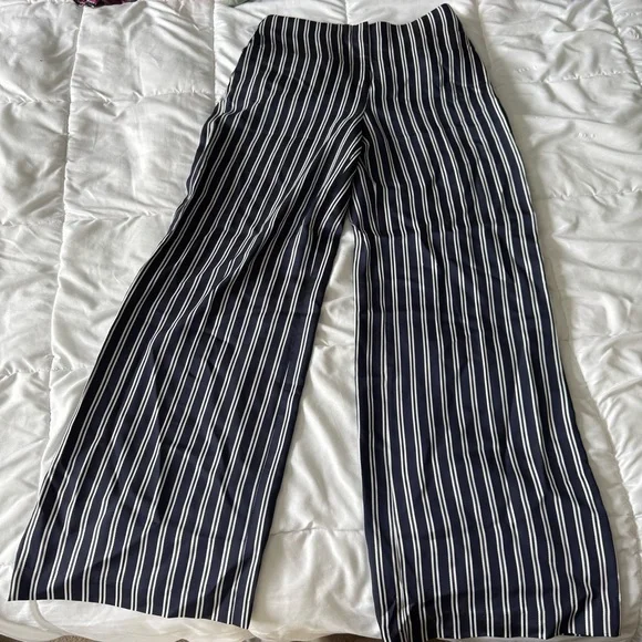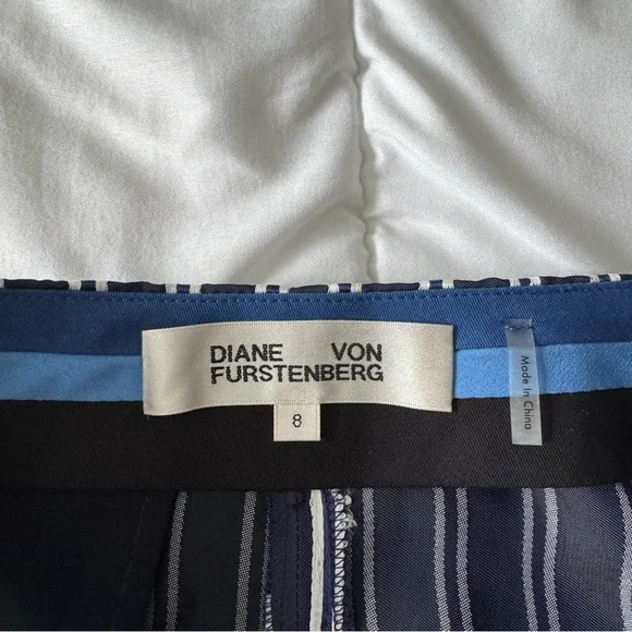 Diane Von Furnstenberg Stripe Wide Leg Palazzo PantSize 8 - High waist- Non-stretchy fabric- Lightweight fabric- Wide-leg- Striped Twill Concealed hook- button and zip fastening at front- Navy blue and white striped- two side pockets- one faux back pocketApproximate flat laying measurements:Waist: 14.5”Rise: 11.5”Inseam: 33”Length: 43.5