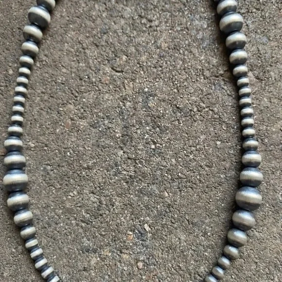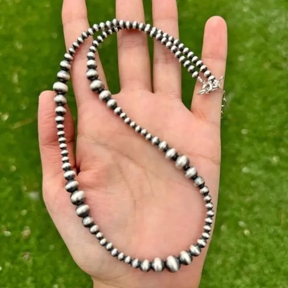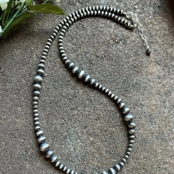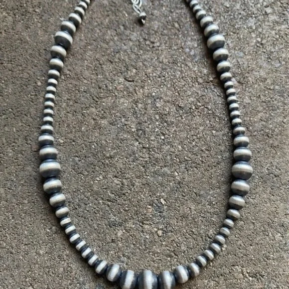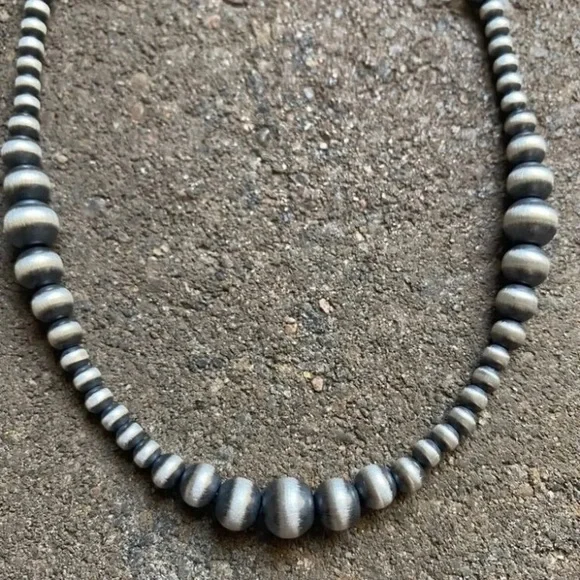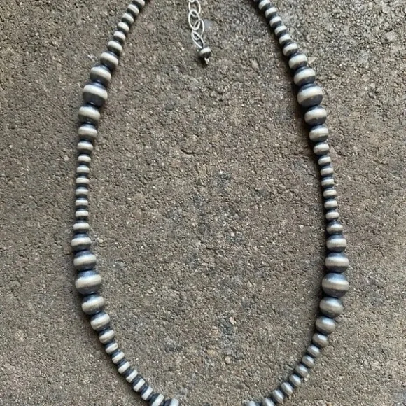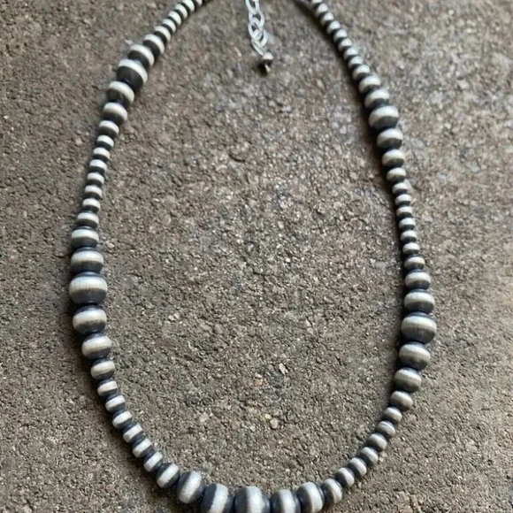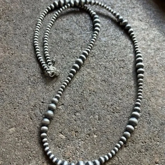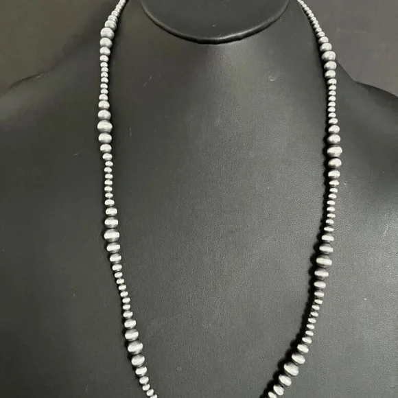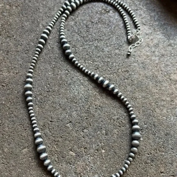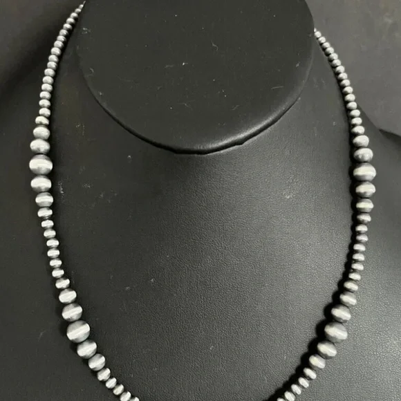 Southwestern 4mm - 8mm Multi Graduated 925 Sterling Silver Oxidized Pearls Bead Necklace. 34 Inch.Lobster clasp with extender chain.Pictures show various lengths available in store.Best Offers Accepted!