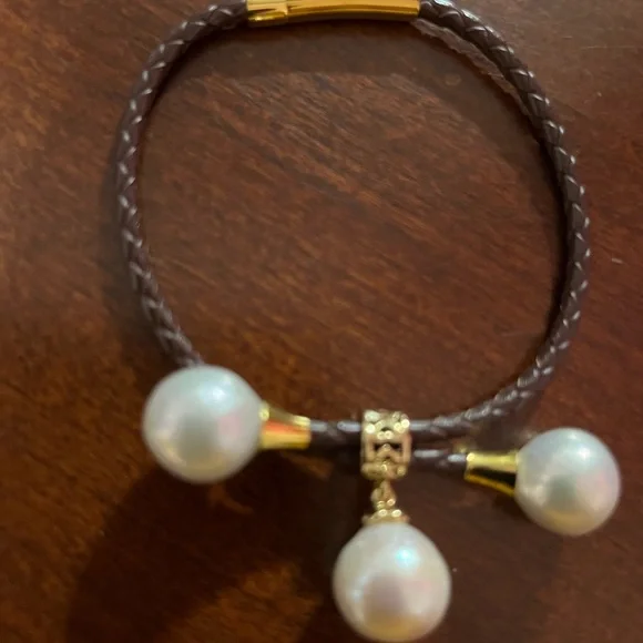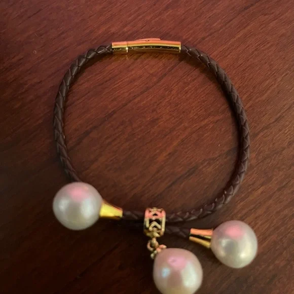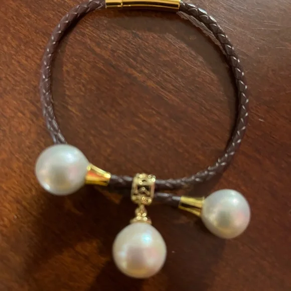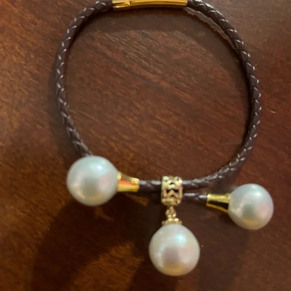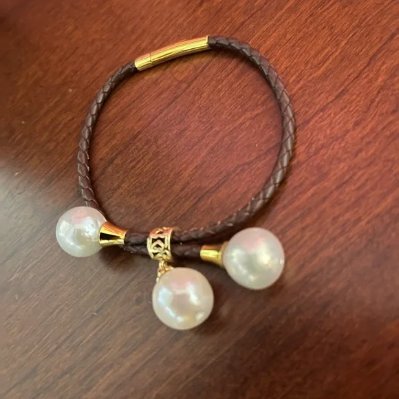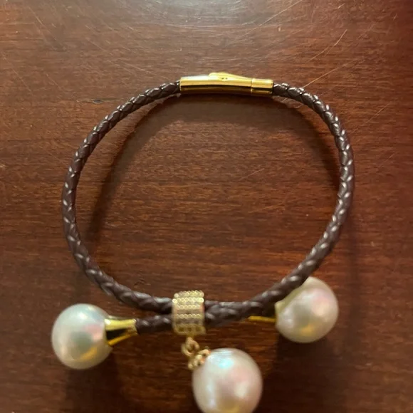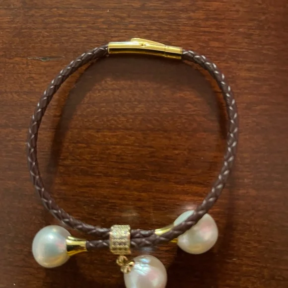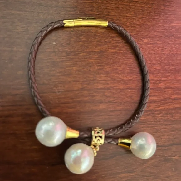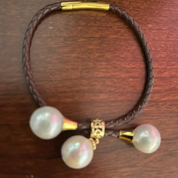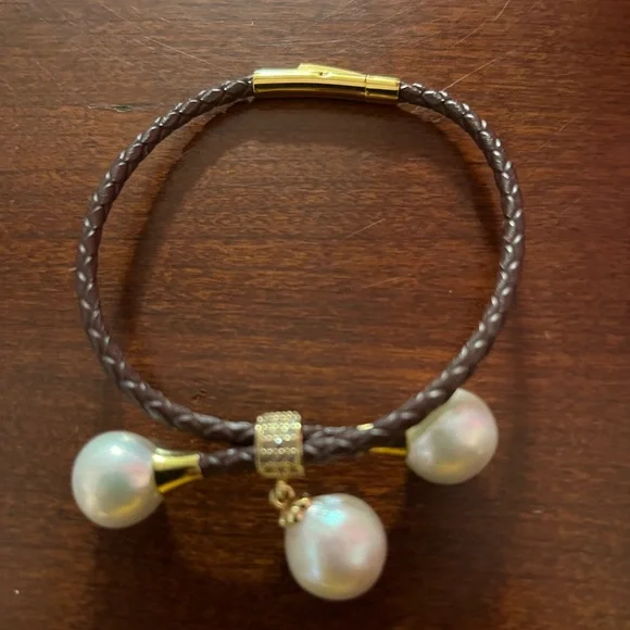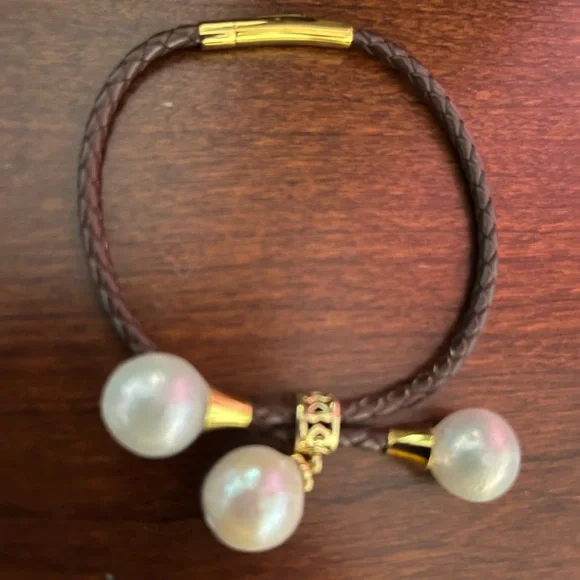 Leather Bracelet with 3 Cultured Pearl 10mm Gold Vermeil