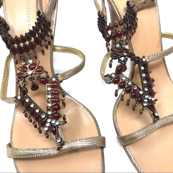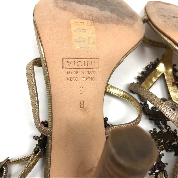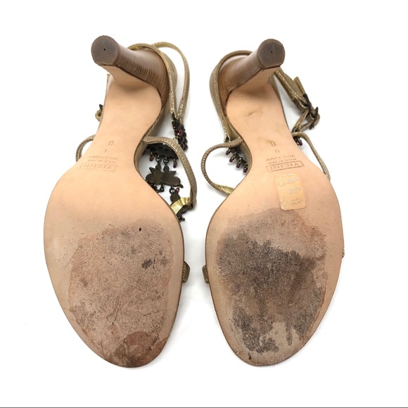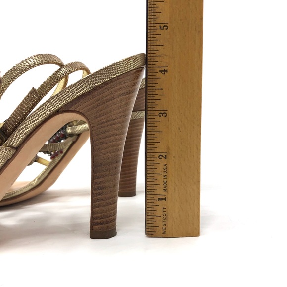 Authentic sophisticated double ankle strap, gypsy-beaded, size 9, made in Italy In gently worn condition. Gorgeous and sexy unique all leather with stunning beading, all intact. Textured gold tone leather strappy sandals with wood heel. Working, adjustable buckle closure.Measurements are approx and not exact.Please review all images and ask questions prior to purchase.