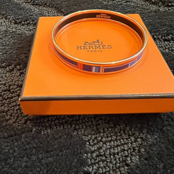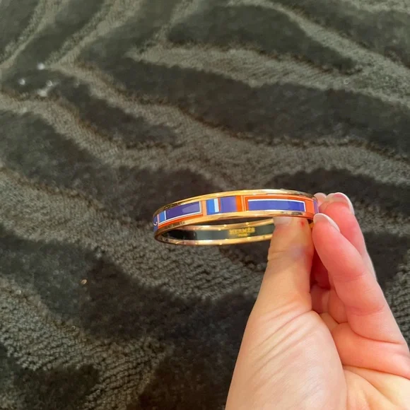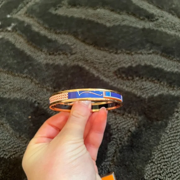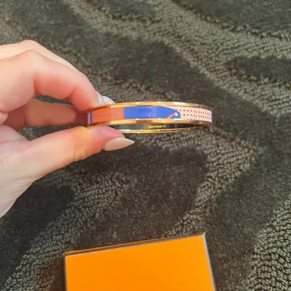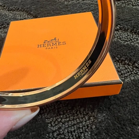 The bangle is the same size as the first photo, but rose gold and a different pattern. It will come with the box and pouch. Rarely worn