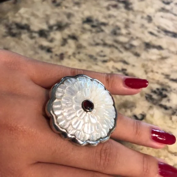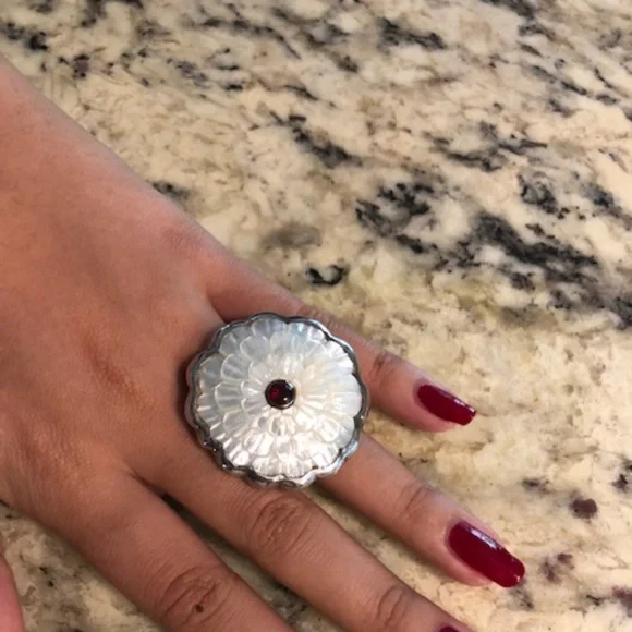 This is a BEAUTIFUL statement piece.If you appreciate artistry and handcrafted pieces, then definitely take a look at this ring.This ring is 100% handcrafted in Bali using Mother of Pearl which was hand-carved into a daisy with a Garnet stone centerpiece.This ring is framed and set using 950 silver.This ring will fit a women´s size 6 ring finger.Also, since this is a statement piece,the length of the daisy from the top to the bottom measures 1 3/4 inches long.