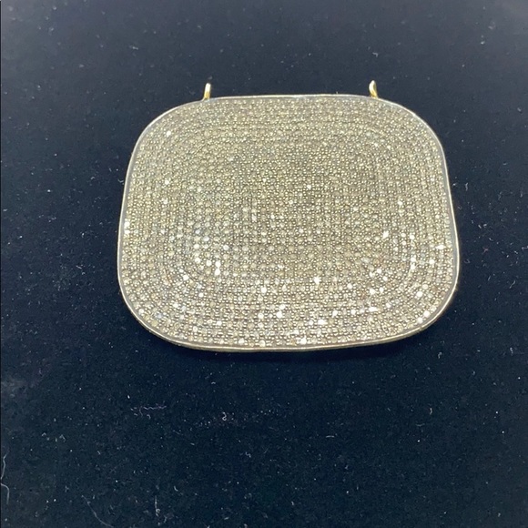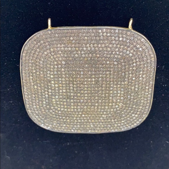 Exquisite pave set diamond pendant. Measures 2 1/8” x 2”Can slide a thin chain through or have it custom beaded. Looks beautiful with hematite. This piece is a show stopper. Hand made and Very unique. Back side is a gold tone (brass likely).
