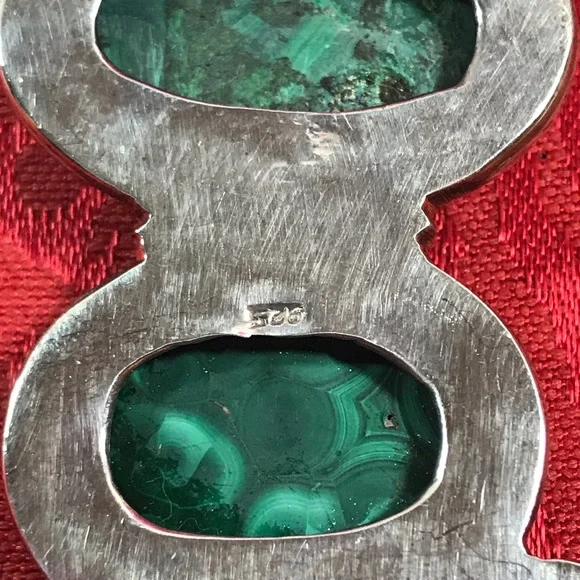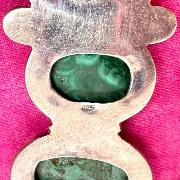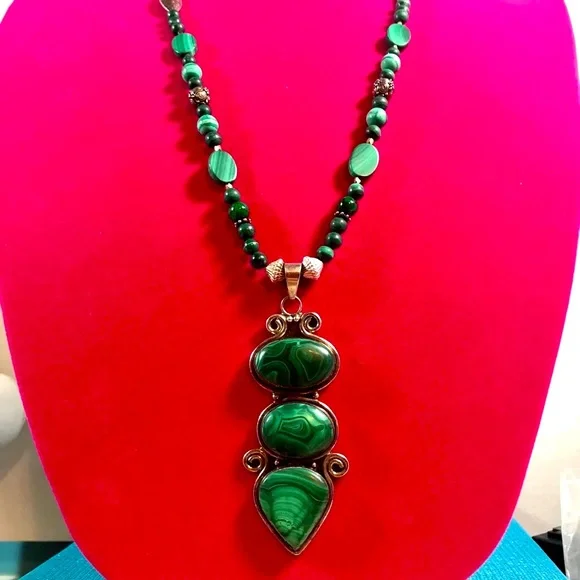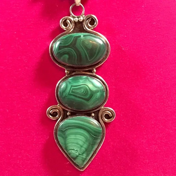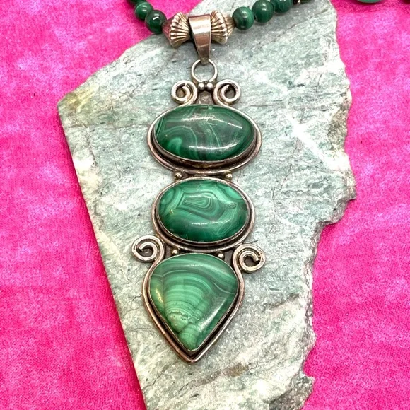 Offering a long 29 inch Malachite Necklace with silver accent beads. The beads in the back are silver tone. The toggle clasp is silver. This features a 4 by 1.5 inch silver Malachite pendant that is stamped .925. Please see pics for details.Cat. 2055