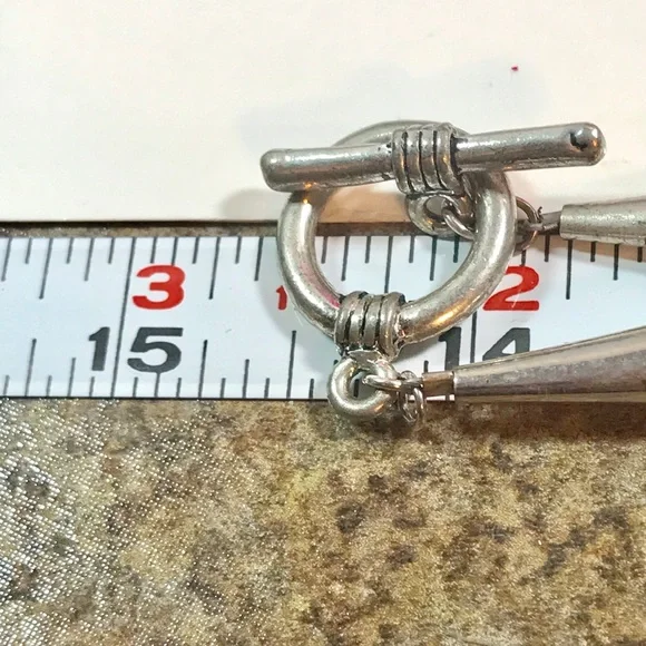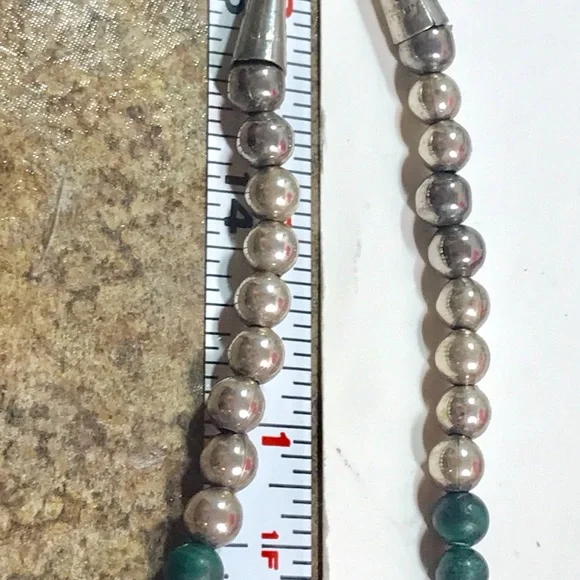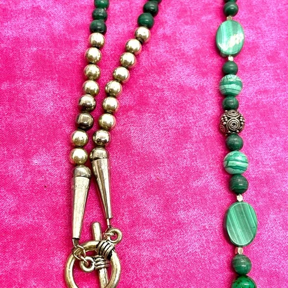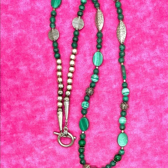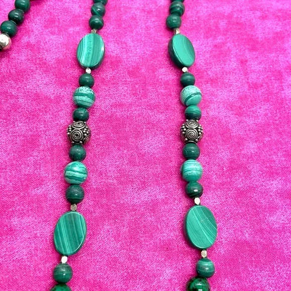 Offering a long 29 inch Malachite Necklace with silver accent beads. The beads in the back are silver tone. The toggle clasp is silver. This features a 4 by 1.5 inch silver...