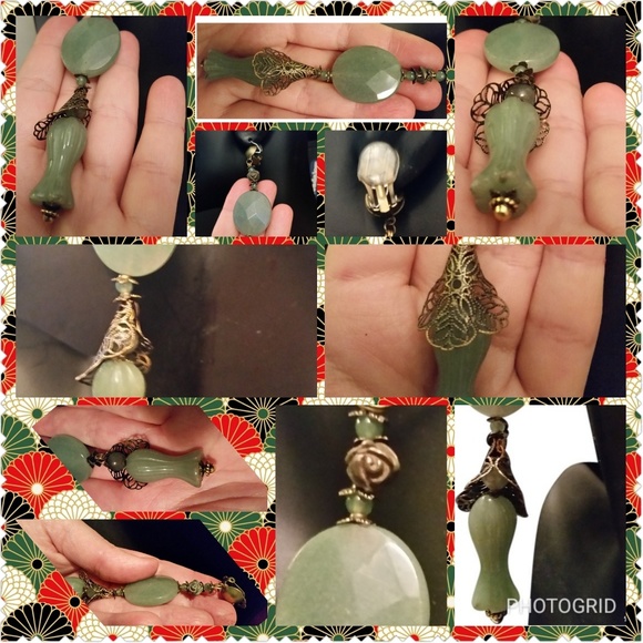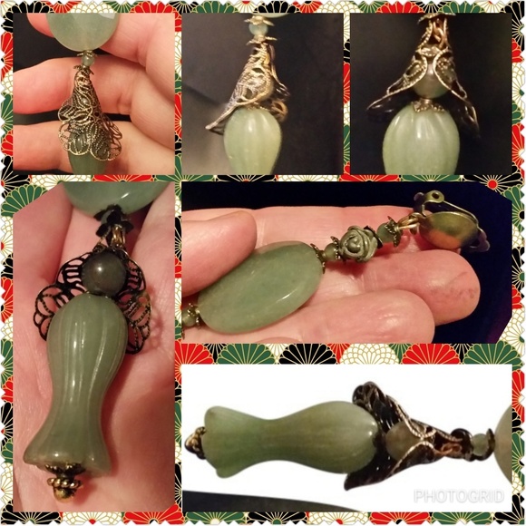 AMAZING Long5.75"Gemstone Dangle Earring, Shoulder Duster Solid Brass Base, Choose PadBronze Pl.Clip/Copper Pl./Brass/FrHook. Green Jade,Trumpet Filigree Bead,Lg. 1.25"x.25"Carv-Tulip Flower in Aventurine,3DHand Carved Pyrite Rose,Bronze Leaf-hang bead caps around Green Jade Beads, GoldPl. leaves&Gems dangle off tiny leaves. Filigree Cutwork Detailed Tulips Flowers that Encase Elegant, Uniquely Stunning, My Original Designs Dazzle.StoreSmokeFree. Ships24hrsM-F,Track#, FreeGift Wrap+Box