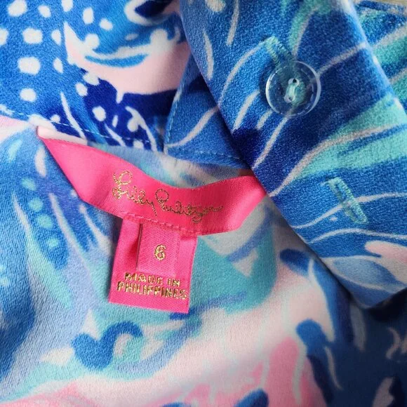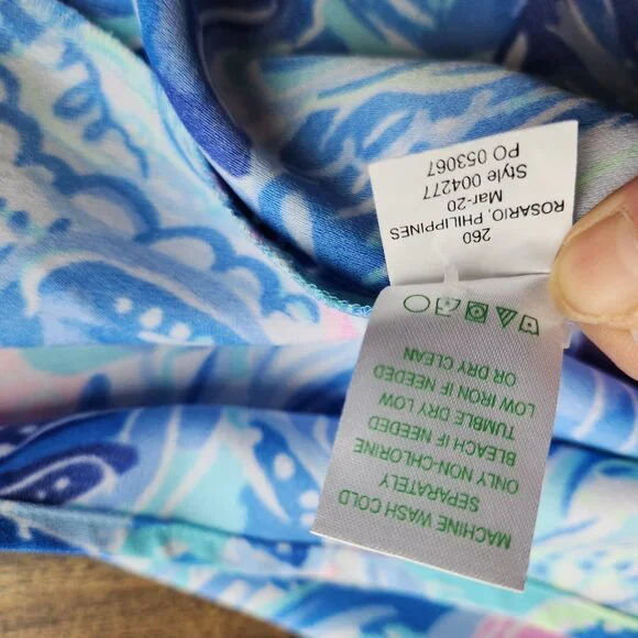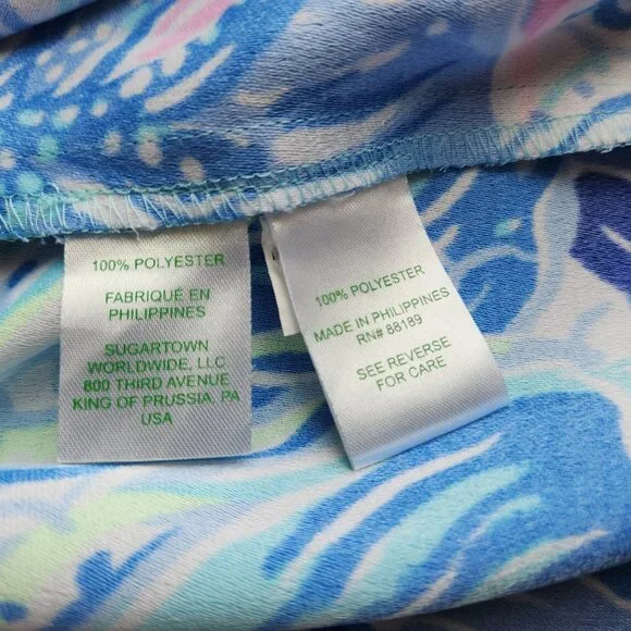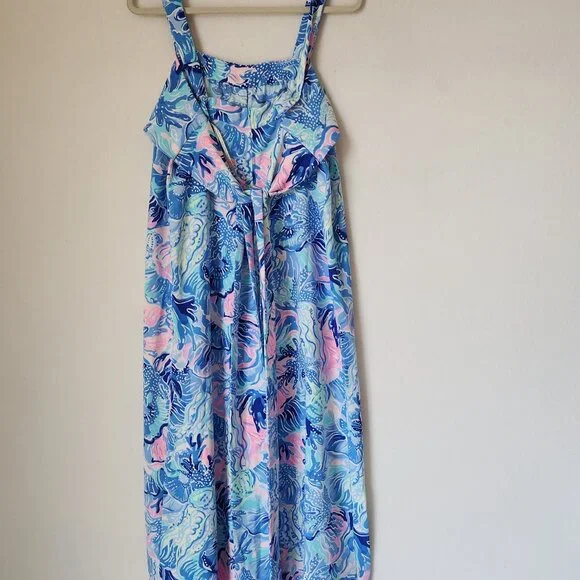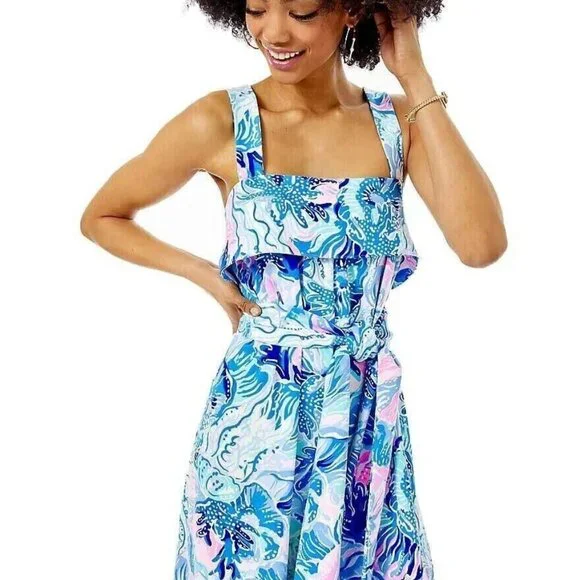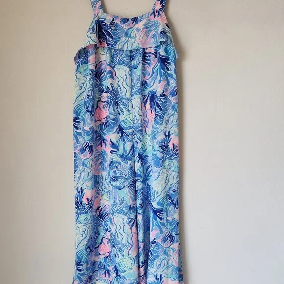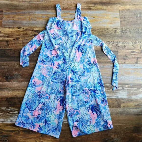 Lilly Pulitzer Tasely Wide-Leg Jumpsuit Saltwater Blue Shade Seekers Oversize 100% PolyesterPre-owned in excellent condition.Retail $198Please Note*The real color of the item may be slightly different from the pictures shown on website caused by many factors.*Don´t go by size number. Do check measurements to determine if the item will fit.Measurements; Approximately (Laying flat).Armpit to armpit: 18 inches (chest measurement)Length: 46 inches (cover to bottom seam)Inseam: 23 inchesOpen Leg: 16 inchesCondition guideNew With Tags - never been used. Tags are still attached.New Without Tags - No wear /never been used condition, but without tags.Excellent - Only slight signs of wearing. Does not diminish the overall appearance of the item.Great - Well-maintained. Shows minor signs of wear that are consistent with use.Good - Shows signs of regular use. Item shows visible wear, minimal flaws or pilling.