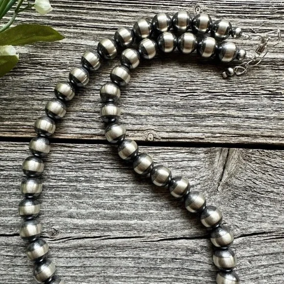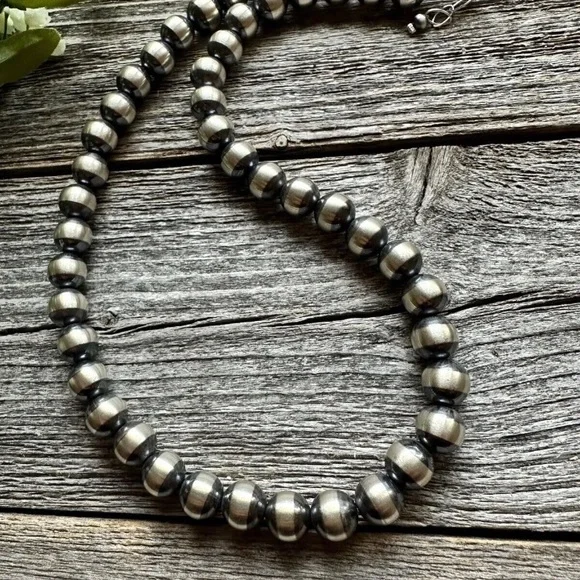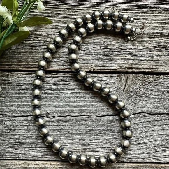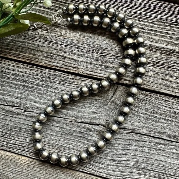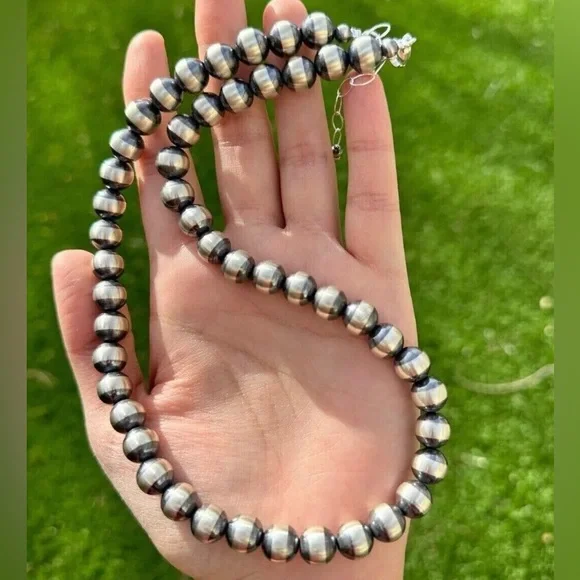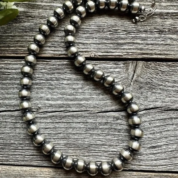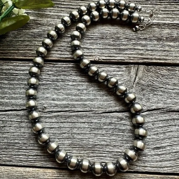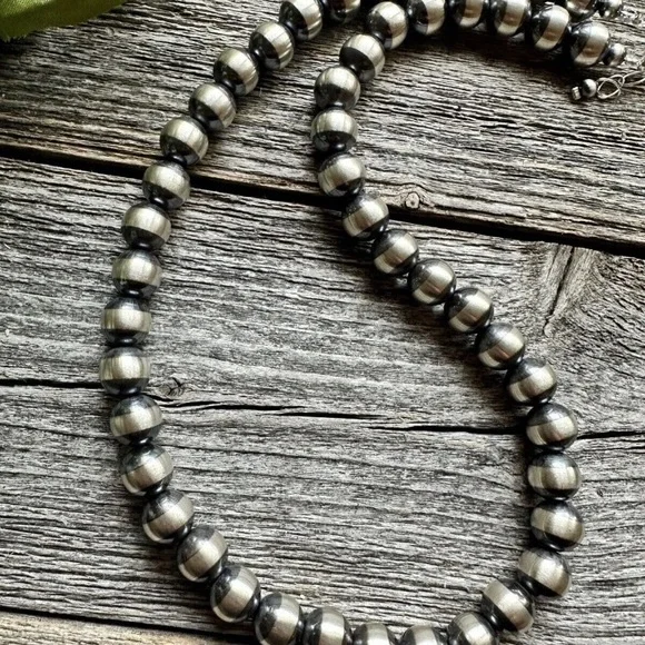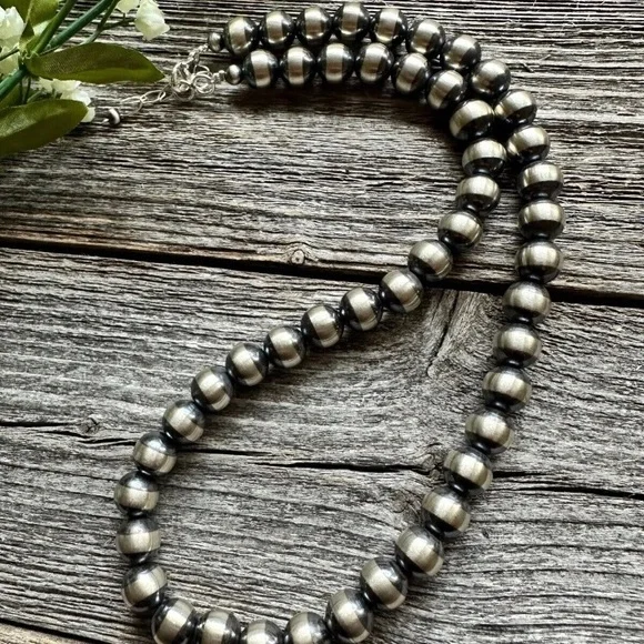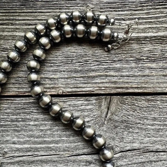 Southwestern 10mm 22 Inch Striped 925 Sterling Silver Oxidized Pearls Bead Necklace.Lobster clasp and extender chain.Best Offers Accepted!