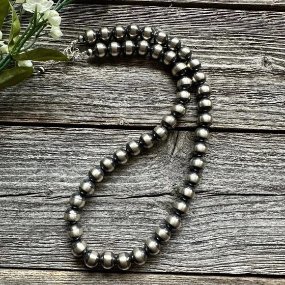 10mm 22 Inch Striped Sterling Silver Oxidized Pearls Bead Necklace Southwestern